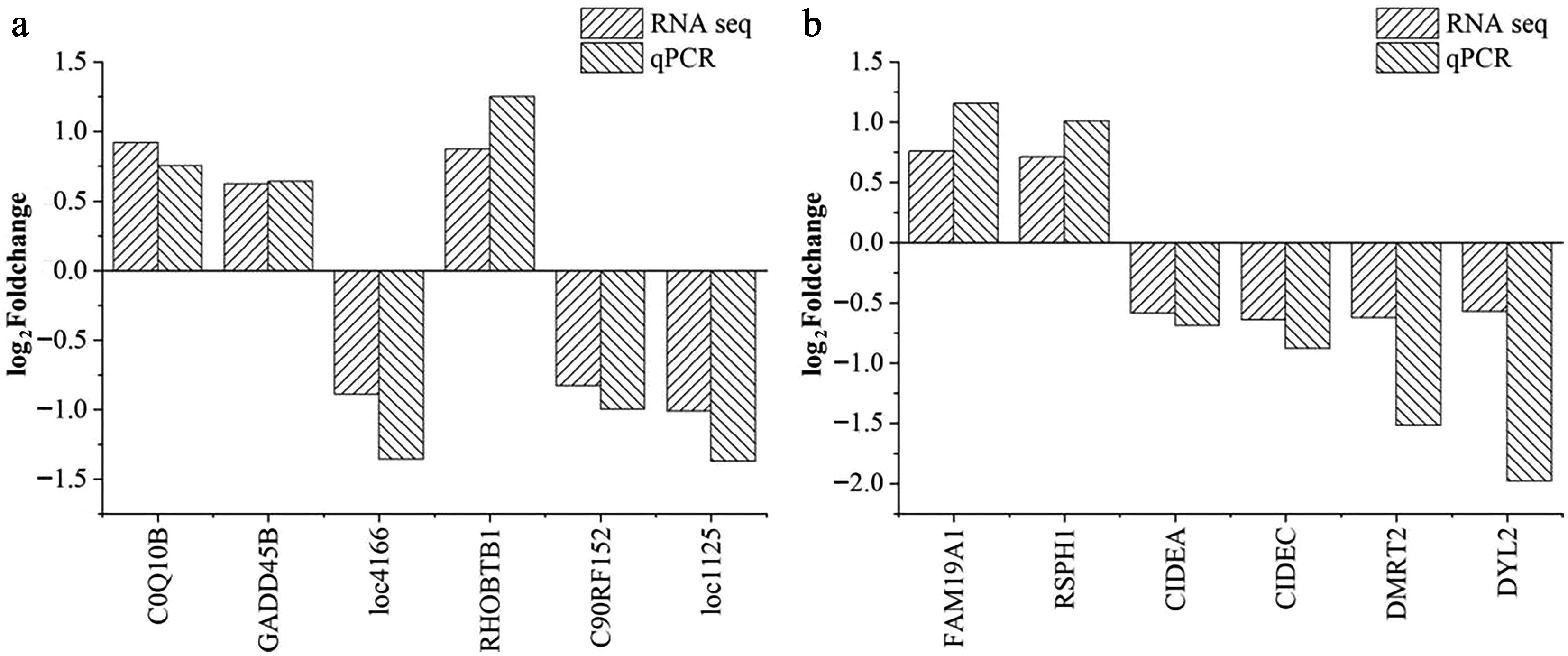 Validation of the differentially expressed genes in (a) pituitary and (b) liver samples. The horizontal axis indicates the DEGs selected for the qPCR analysis; the vertical axis represents the log2(fold change) values between the CHS and CON groups. Abbreviations: CHS group, chronic heat stress group; CON group, control group.