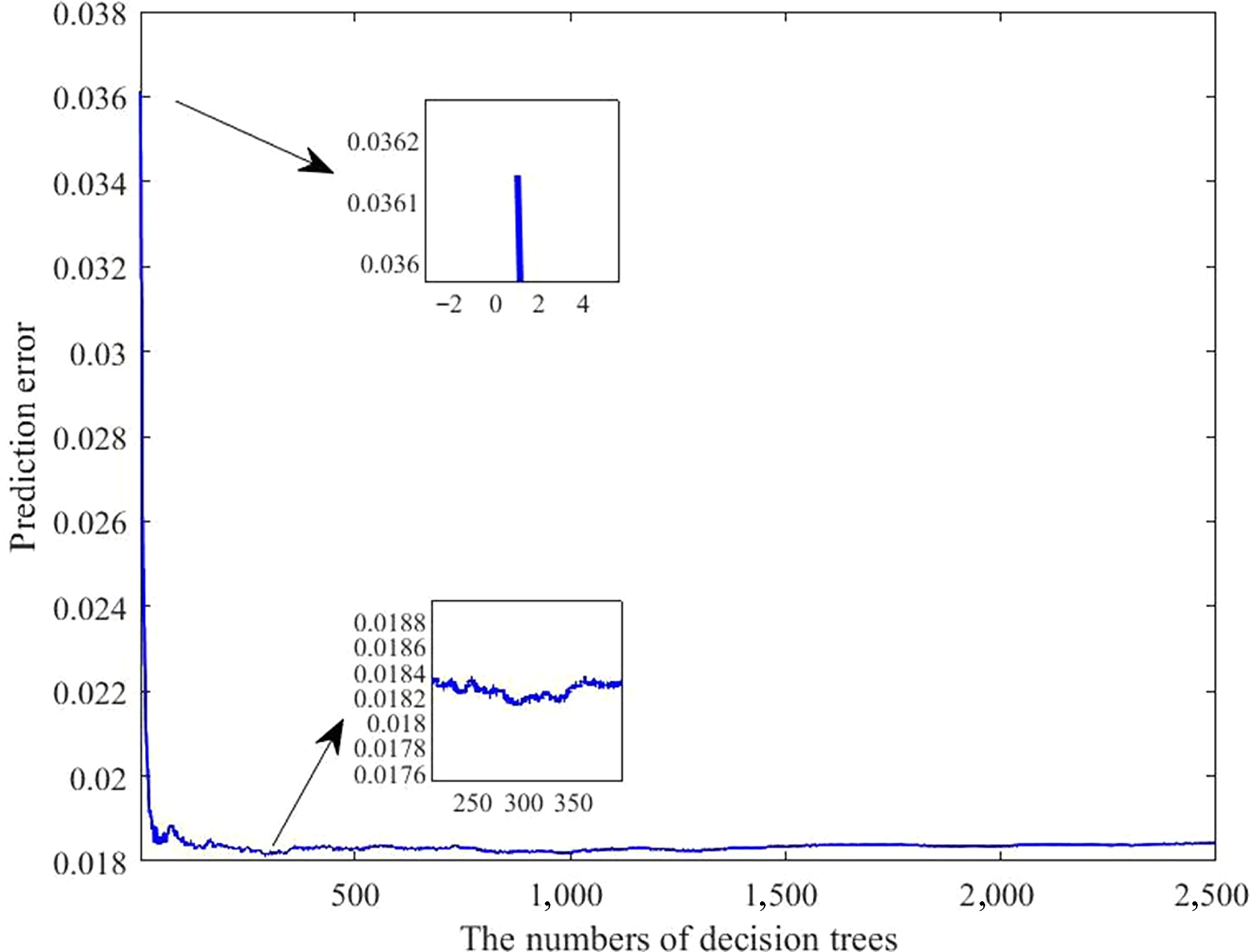 • As shown in Fig. 7, the prediction error was highest when a single decision tree was used. With an increasing number of trees, the error gradually decreased. After iterative optimization, the ensemble containing about 300 trees achieved the highest predictive accuracy.
