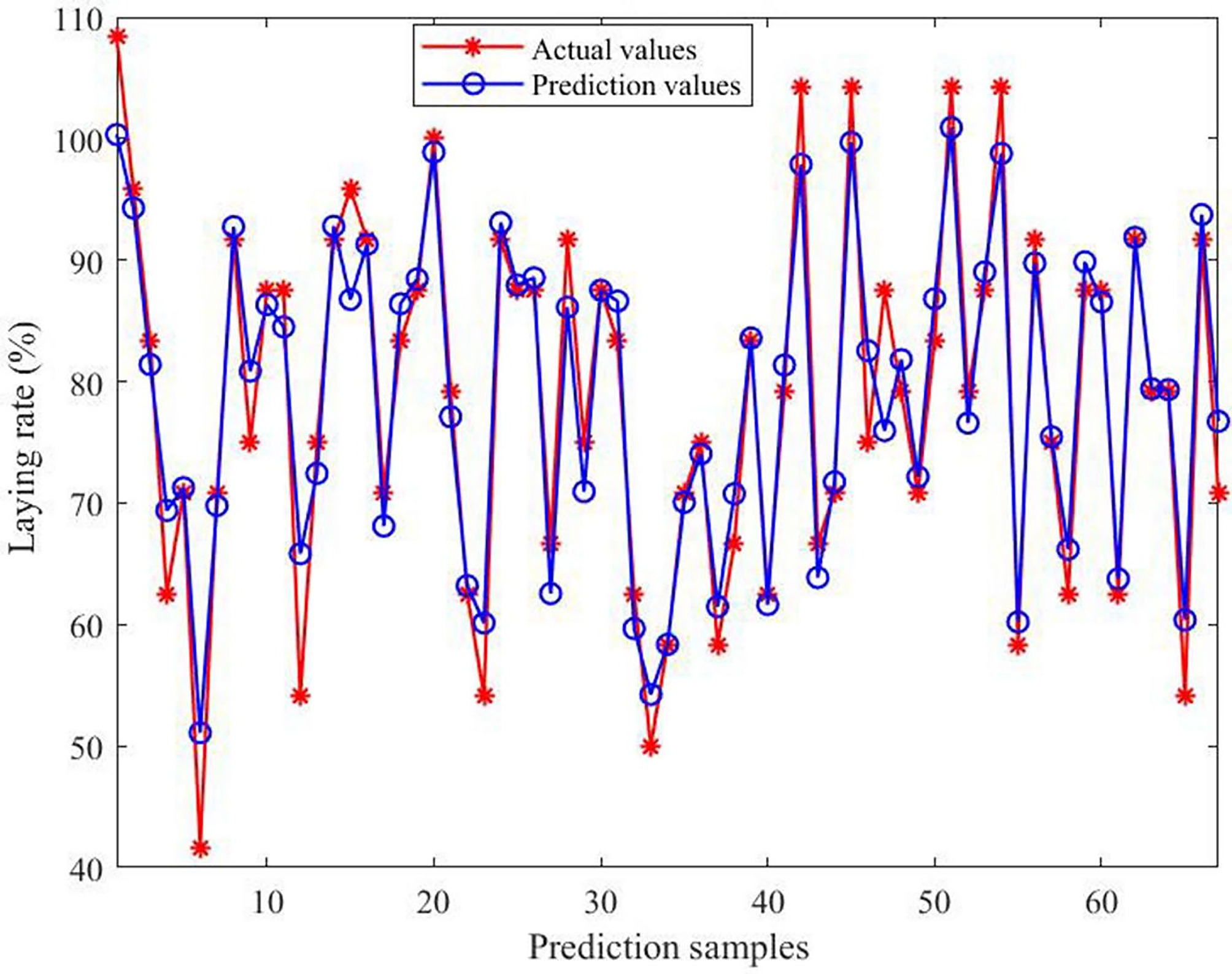 Comparison of actual and predicted values of the model. The horizontal axis indicates the number of predicted samples; the vertical axis indicates the laying rate.