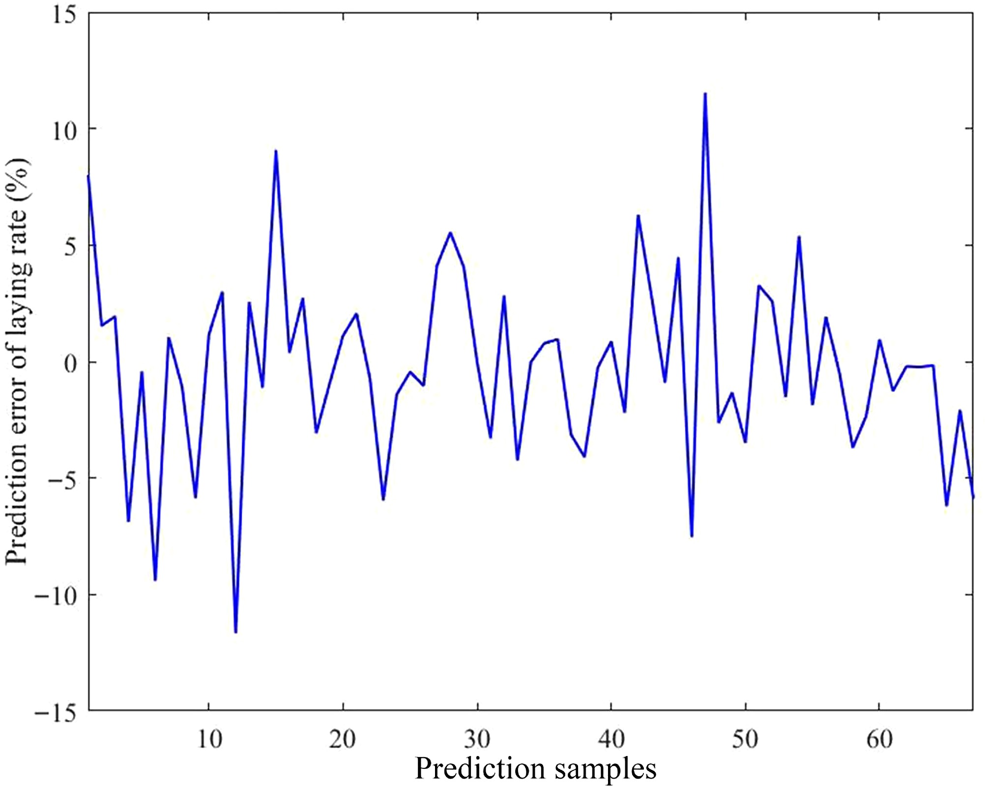 Prediction error of the model. The horizontal axis indicates the number of predicted samples; the vertical axis indicates the prediction error of the laying rate.