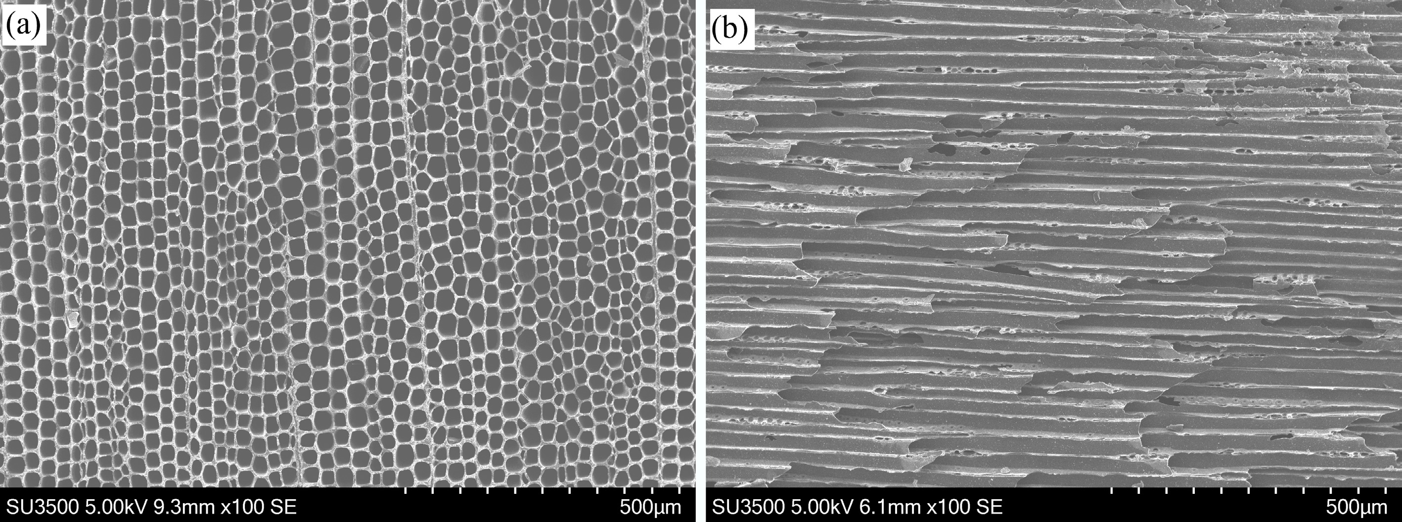 SEM images of pine biochar (a) produced at 1,000 °C in axial, and (b) transverse orientations.