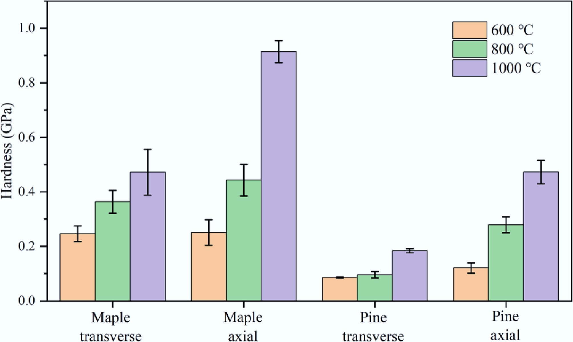 The hardness of biochar samples was measured across different wood species at different pyrolysis temperatures (600, 800, and 1,000 °C) in axial and transverse directions. The hardness values of maple and pine biochar at different pyrolysis temperatures are shown in Table 2 and Fig. 2 for better visualization. Five tests were conducted at different areas for each sample, and the average hardness was calculated.