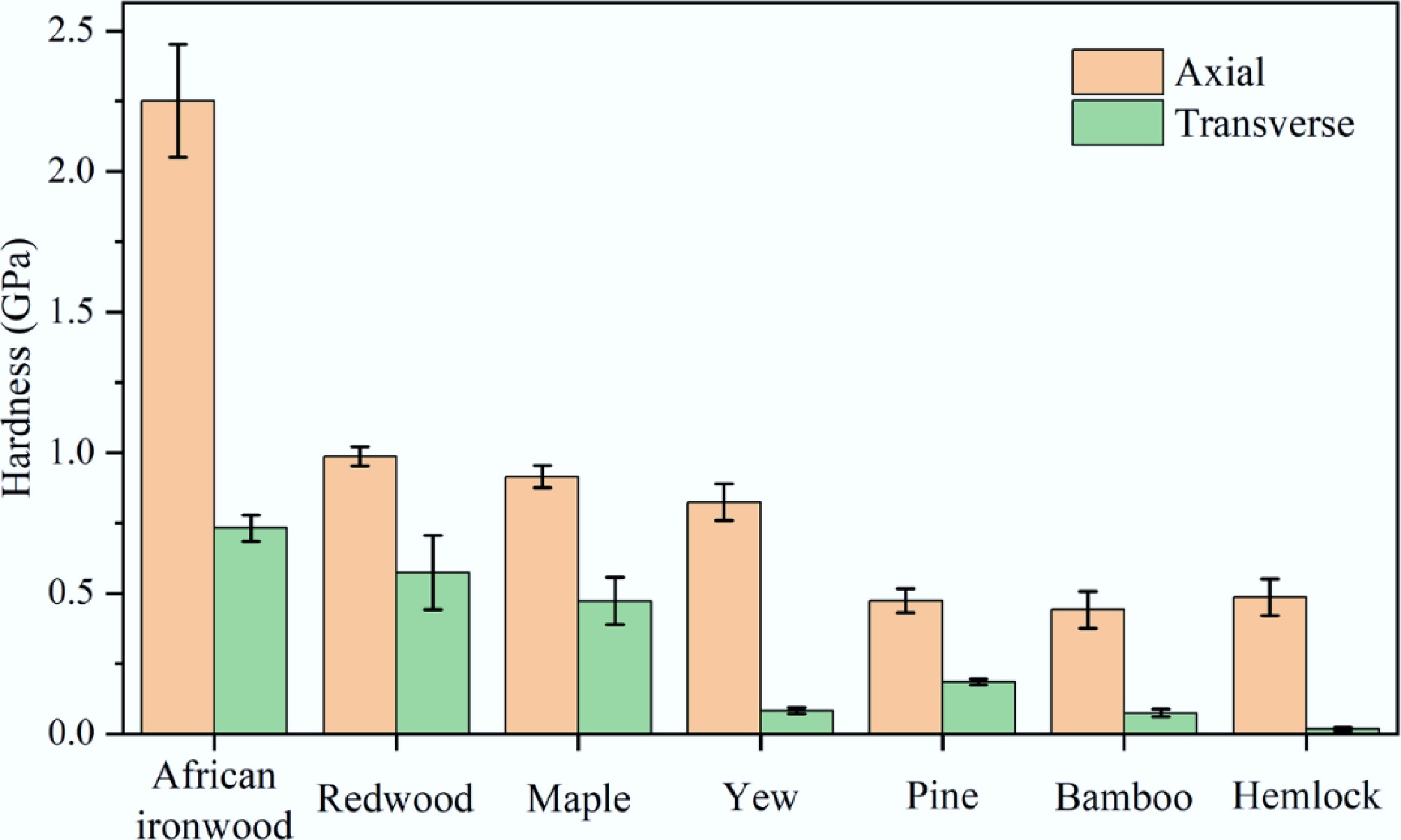 African ironwood achieves mild steel-like axial hardness (2.25 GPa) — the highest for wood-derived biochar.