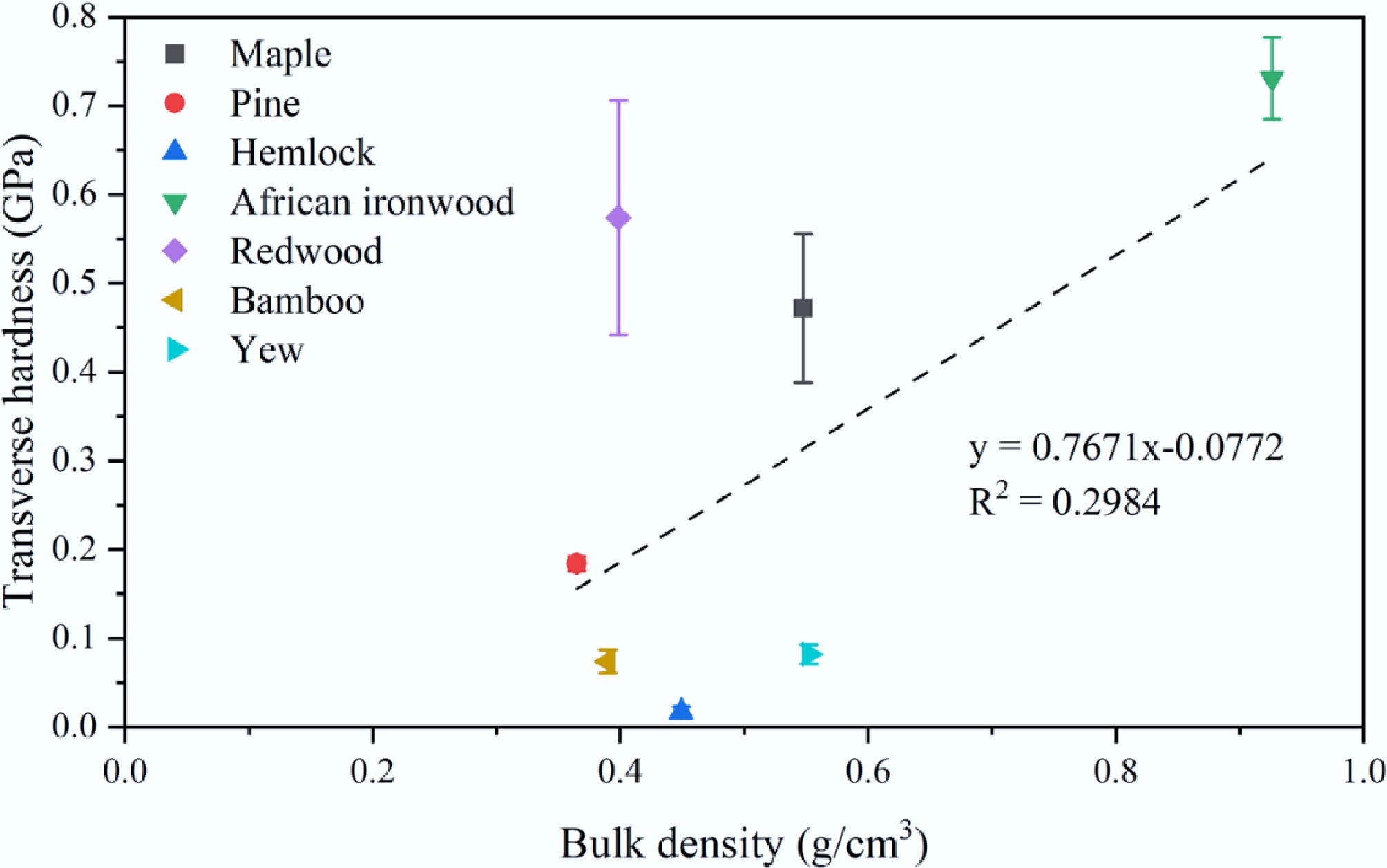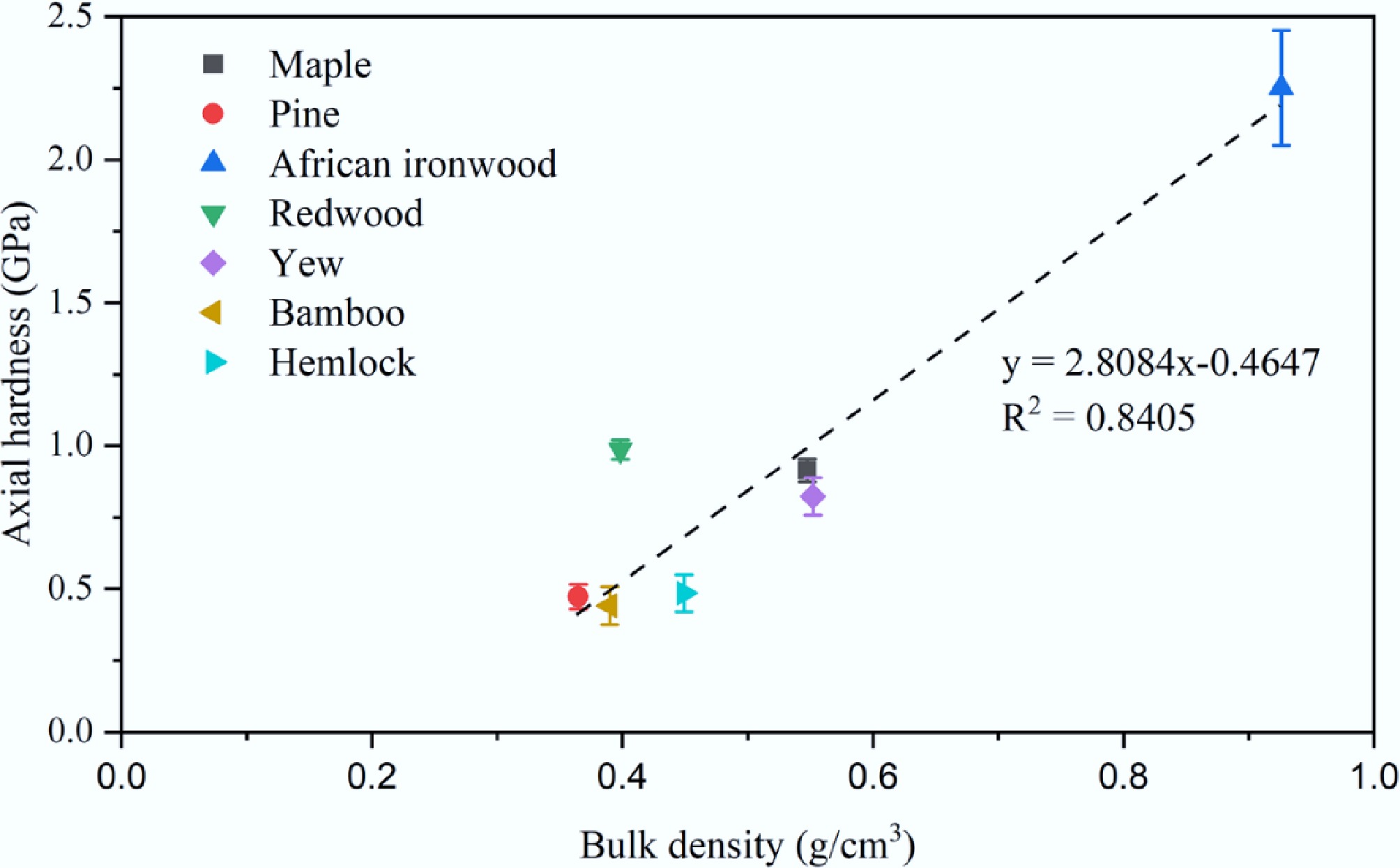 temperature (°C)Bulk density (g/cm3) Wood density (g/cm3) Maple 600 0.4125 0.78 800 0.4423 1,000 0.5474 Pine 600 0.3002 0.41 800 0.3509 600 Pine 1,000 0.3647 African ironwood 1,000 0.9260 1.35 Redwood 1,000 0.3983 0.68 Yew 1,000 0.5521 0.72 Bamboo 1,000 0.3898 0.76 Hemlock 1,000 0.4490 0.55 The relationship between hardness and bulk density reveals the significant anisotropy in biochar's mechanical behavior. As illustrated in Figs 4 and 5, a linear correlation was observed between hardness and bulk density, with substantially stronger correlation in the axial direction (R2 = 0.8405) compared to the transverse direction (R2 = 0.2981). In the axial direction, there is a strong linear relationship between hardness and bulk density. The carbonized cell walls in this direction are compact and aligned, providing uniform resistance to deformation under load. Increased bulk density corresponds to reduced porosity and enhanced structural cohesion, leading to greater axial hardness. In contrast, the correlation in the transverse direction is significantly weaker. The transverse surface exposes both solid cell wall material and voids, which disrupt the uniform transmission of force during indentation, resulting in greater variability in measured hardness.
