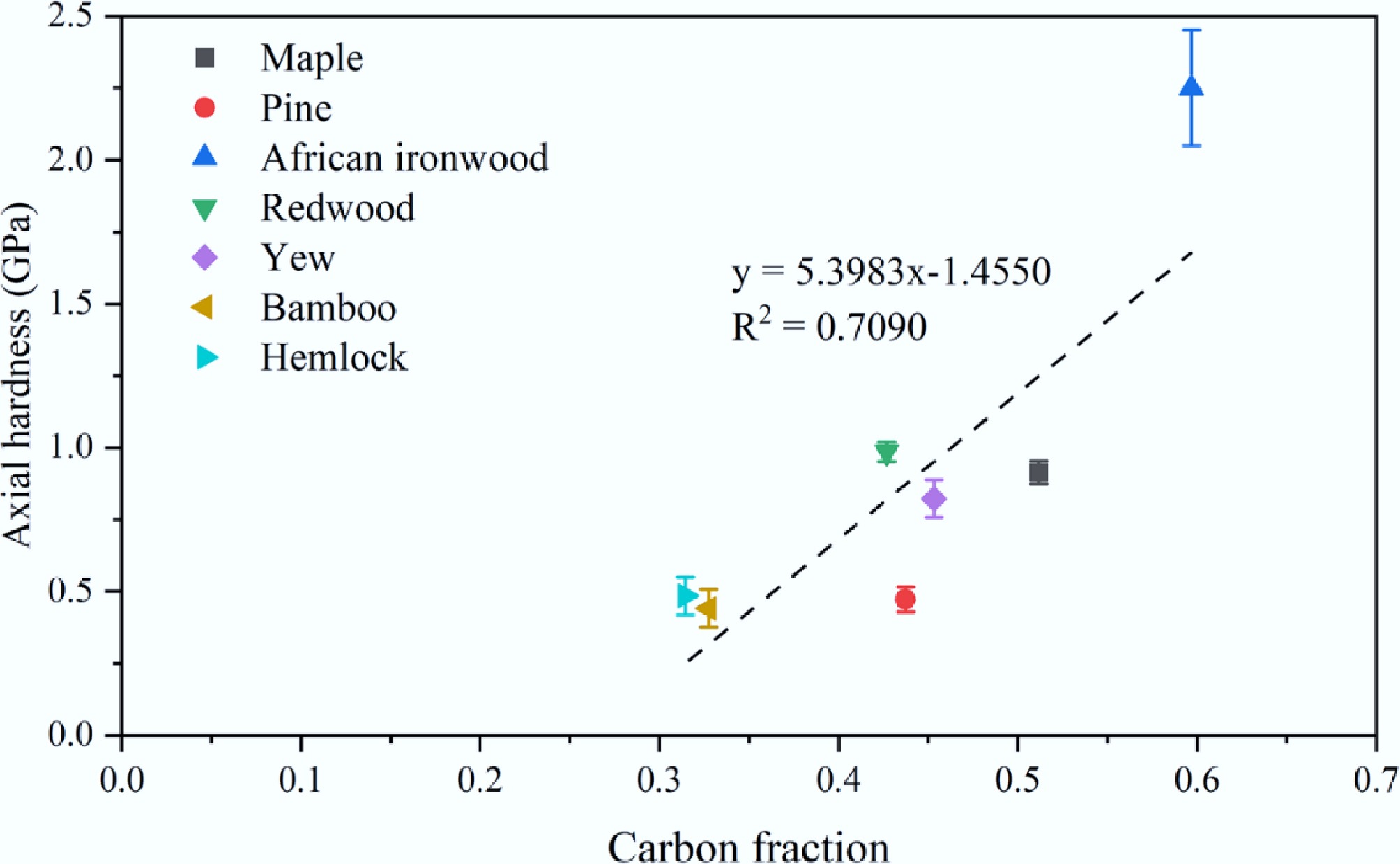 Axial hardness strongly correlates with bulk density (R2 = 0.84) and carbon fraction (R2 = 0.71).