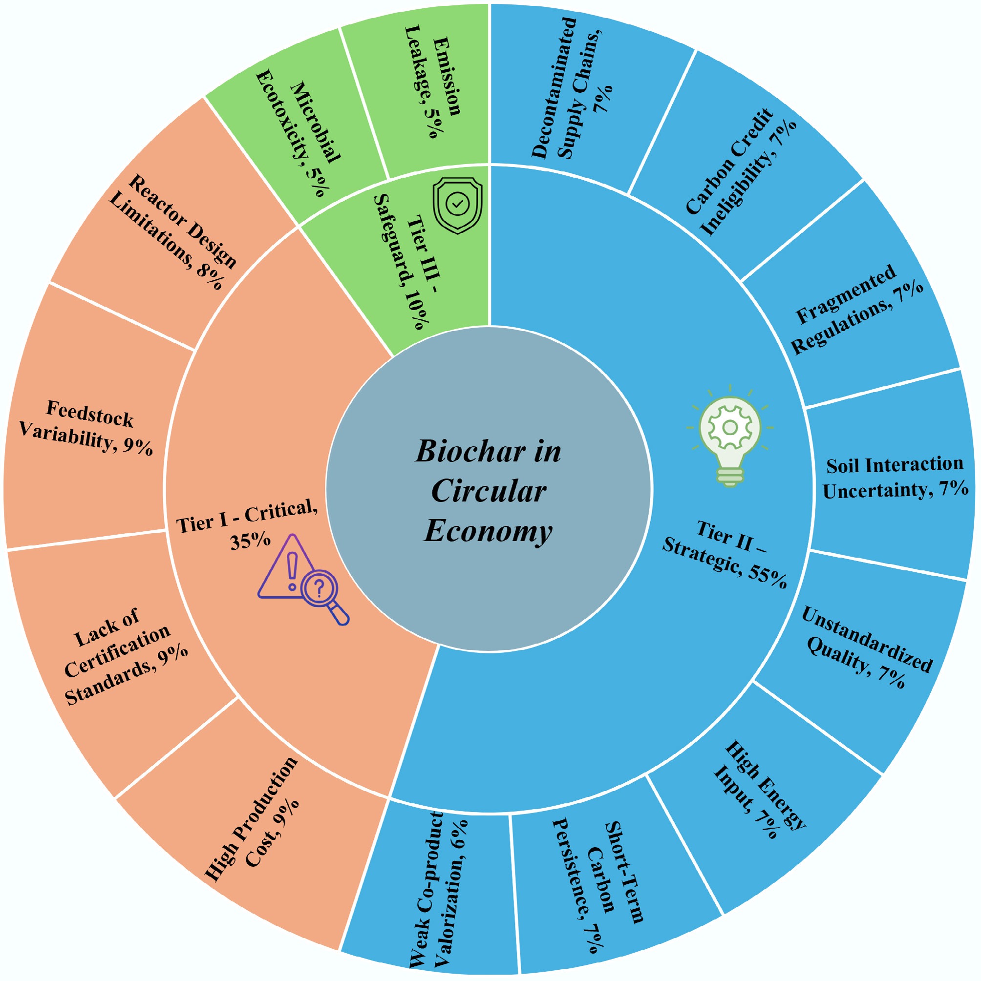 Systemic barriers to biochar integration in circular economy pathways. The pie chart illustrates proportional constraints hindering deployment, grouped into three tiers. Tier I (35%) includes feedstock variability, reactor design limitations, lack of certification standards, and high production cost. Tier II (55%) covers high energy input, soil uncertainties, fragmented regulations, decentralized supply chains, unstandardized quality, carbon credit ineligibility, weak co-product valorization, and short-term carbon persistence. Tier III (10%) comprises emissions leakage and microbial ecotoxicity. These barriers highlight leverage points for targeted technological, policy, economic, and environmental interventions.