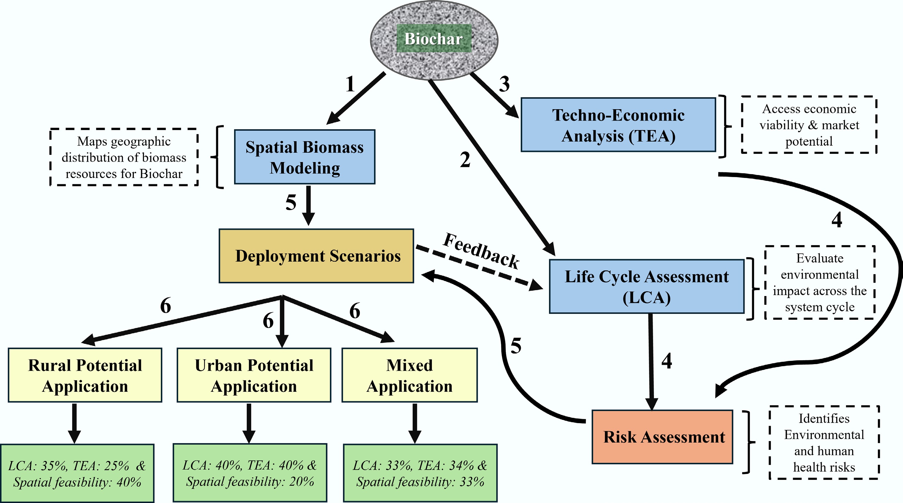 Furthermore, deployment must be coupled with market instruments that internalize externalities and de-risk investment. These include carbon crediting schemes, payments for ecosystem services, public procurement guarantees, and infrastructure subsidies. However, such instruments are not panaceas. They require robust metrics and verification protocols grounded in scientific evidence and calibrated to local conditions. Figure 2 presents an integrated framework combining Spatial Biomass Modeling, LCAs, and TEAs to inform evidence-based biochar deployment. Overall, the flow pattern in the diagram reflects a sequential and integrative systems approach, beginning with Step 1: Spatial Biomass Modeling, which identifies and maps the geographic distribution of biomass resources suitable for biochar production. This modeling feeds into the core component, Biochar, from which the analysis branches into two major streams. Step 2: LCA evaluates the environmental impacts of biochar systems, while Step 3: TEA assesses the economic viability and market potential. Outputs from the LCA inform Step 4: Risk Assessment, addressing potential environmental and human health concerns. A feedback loop from LCA then connects to Step 5: Deployment Scenarios, where insights from earlier assessments are synthesized to design adaptive strategies. Finally, these scenarios inform Step 6: Application Pathways, directing biochar use across three domains: rural, urban, and mixed applications. The structured flow underscores a circular and iterative decision-making framework that integrates sustainability, risk, and economic performance into practical biochar deployment. In rural deployment contexts, spatial feasibility holds the highest weight (~40%) due to infrastructure limitations and the critical role of biomass accessibility and logistics, while LCA and TEA contribute moderately (35% and 25%, respectively). In urban settings, LCA and TEA are equally prioritized (~40% each) owing to stringent regulatory environments and economic constraints, with spatial feasibility being less critical (20%). For mixed or integrated applications, all three factors, LCA, TEA, and spatial modeling, are weighted nearly equally (~33%), reflecting the need for balanced consideration in regional or national deployment strategies. This enables spatially resolved, context-specific strategies to mainstream biochar within circular economy systems. Rural applications of biochar target soil improvement and carbon sequestration using local biomass, while urban applications focus on waste valorization, water treatment, and green infrastructure[19]. Mixed applications bridge rural production and urban use through decentralized systems and regional bioeconomy integration.