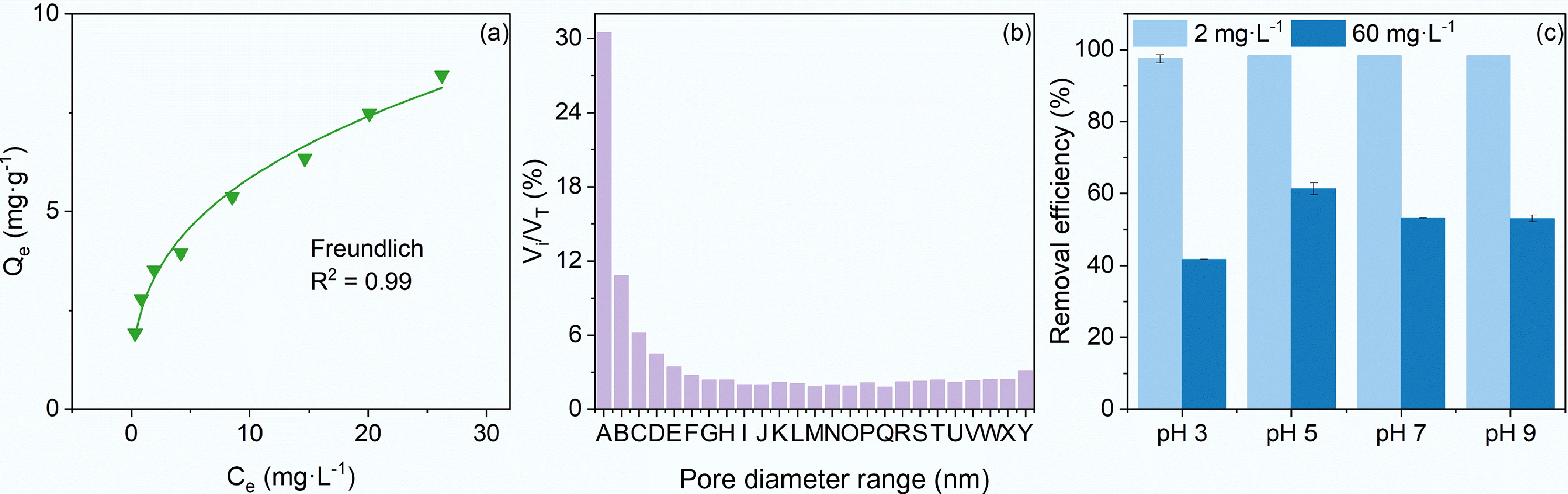 The adsorption of TC on biochar and the physical characterization of biochar. (a) Adsorption isotherms of TC on 4 g·L−1 BC700. (b) The pore size distribution of BC700, and A−Y are specific pore diameter ranges (nm), respectively: 313.8–51.4, 51.4–27.8, 27.8–19.2, 19.2–14.7, 14.7–11.9, 11.9–9.9, 9.9–8.5, 8.5–7.5, 7.5–6.6, 6.6–5.9, 5.9–5.4, 5.4–4.9, 4.9–4.5, 4.5–4.1, 4.1–3.8, 3.8–3.5, 3.5–3.2, 3.2–3.0, 3.0–2.8, 2.8–2.6, 2.6–2.4, 2.4–2.2, 2.2–2.0, 2.0–1.8, 1.8–1.7. Vi is the incremental pore volume (cm3·g−1) for each pore with different diameter range, and VT is the total pore volume (cm3·g−1) for all pores. (c) Removal efficiency of TC with an initial concentration 2 and 60 mg·L−1 after its interaction with BC700 for 24 h at pH 3–9.