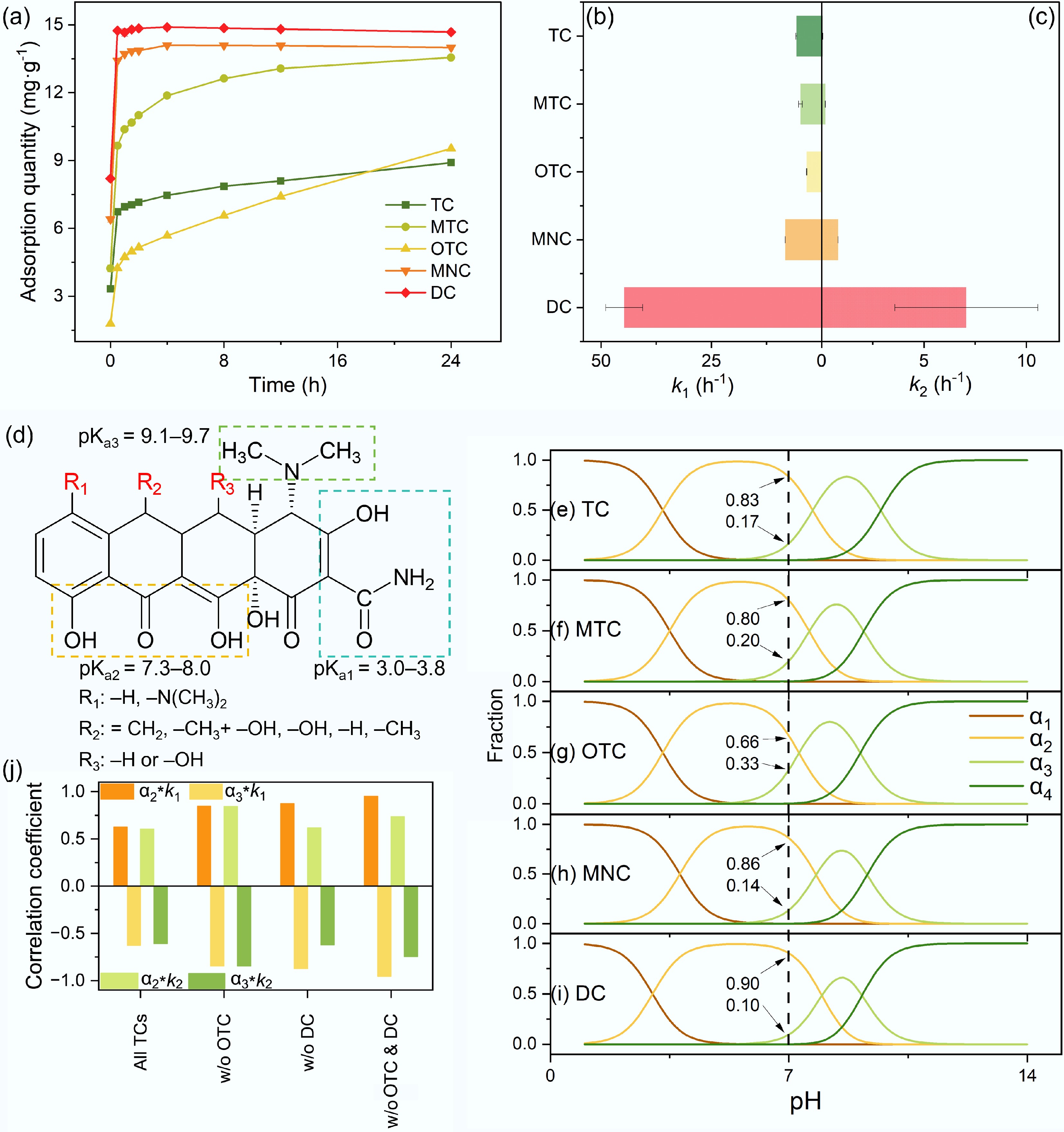 Adsorption kinetics of TCs on BC700 and the impacts of TCs dissociation species. (a) Adsorption kinetic profiles of five TCs at 60 mg·L−1 onto 4 g·L−1 BC700 at pH 7. (b), (c) Fast-stage (k1), and slow-stage (k2) adsorption rate constants fitted by DEM. (d) Dissociation functional moieties of TCs and their corresponding pKa values. (e)–(i) pH-dependent speciation distributions of TC, MTC, OTC, MNC, and DC. (j) Pearson correlation coefficients between the relative abundances of TCs neutral (α2), and monoanionic (α3) species with k1 and k2.