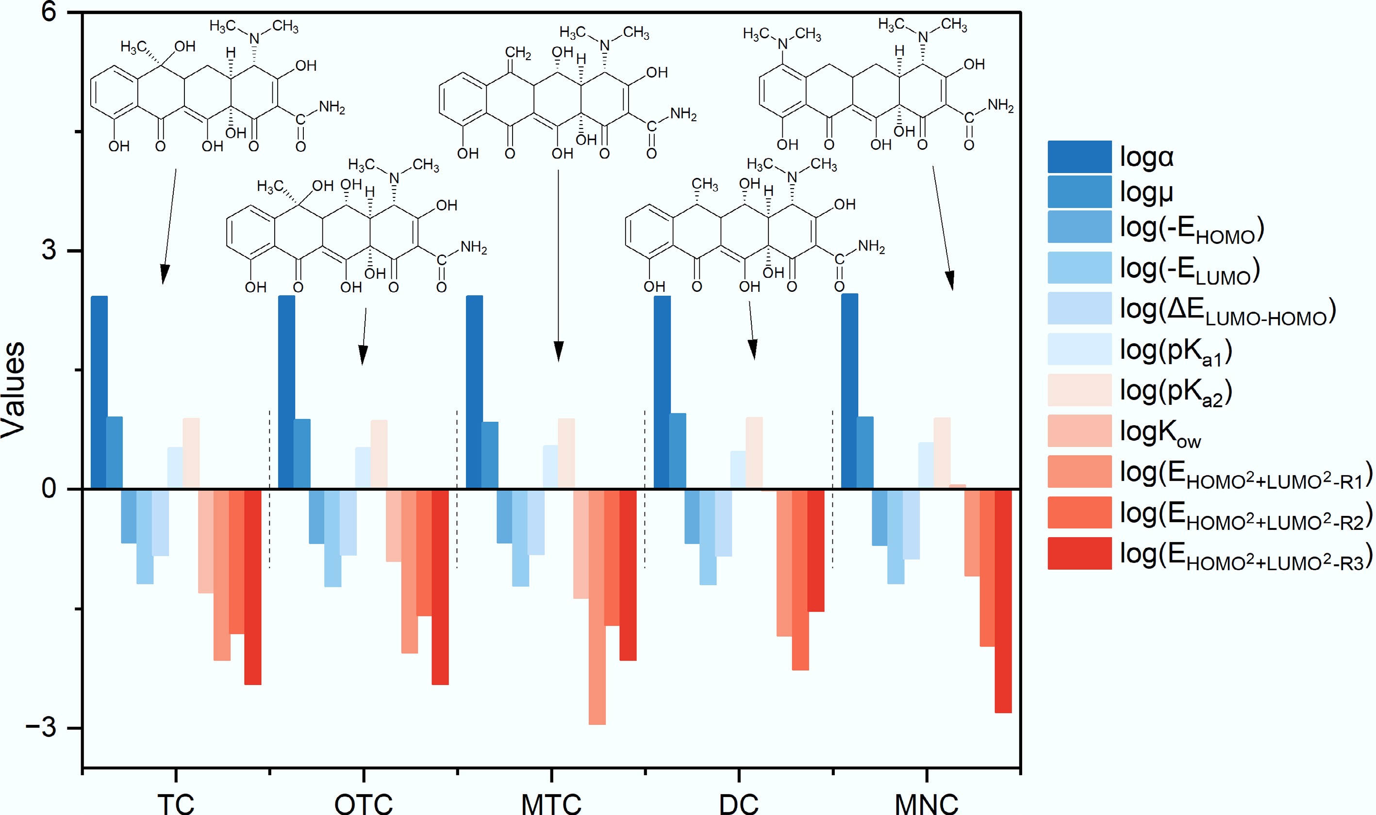• Gaussian 09 software was utilized to optimize the molecular structures of the five TCs at the RB3LYP/6-31G(d) level, ensuring that all optimized structures corresponded to the lowest-energy conformations on the potential energy surface. Key quantum chemical parameters, including the highest occupied molecular orbital energy (EHOMO), lowest unoccupied molecular orbital energy (ELUMO), polarizability (α), and dipole moment (μ), were calculated. A total of eight quantum chemical descriptors were derived from these computations, encompassing EHOMO, ELUMO, α, μ, the frontier orbital energy gap (ΔELUMO−HOMO), and the sum of squared EHOMO and ELUMO values for substituent (R1, R2, R3)-linked carbon atoms (${\mathrm{E}}_{{\mathrm{HOMO}}^2+{\mathrm{LUMO}}^2-{\mathrm{R}}1} $, ${\mathrm{E}}_{{\mathrm{HOMO}}^2+{\mathrm{LUMO}}^2-{\mathrm{R}}2} $, ${\mathrm{E}}_{{\mathrm{HOMO}}^2+{\mathrm{LUMO}}^2-{\mathrm{R}}3} $), which were used to further evaluate the chemical reactivity of TCs.