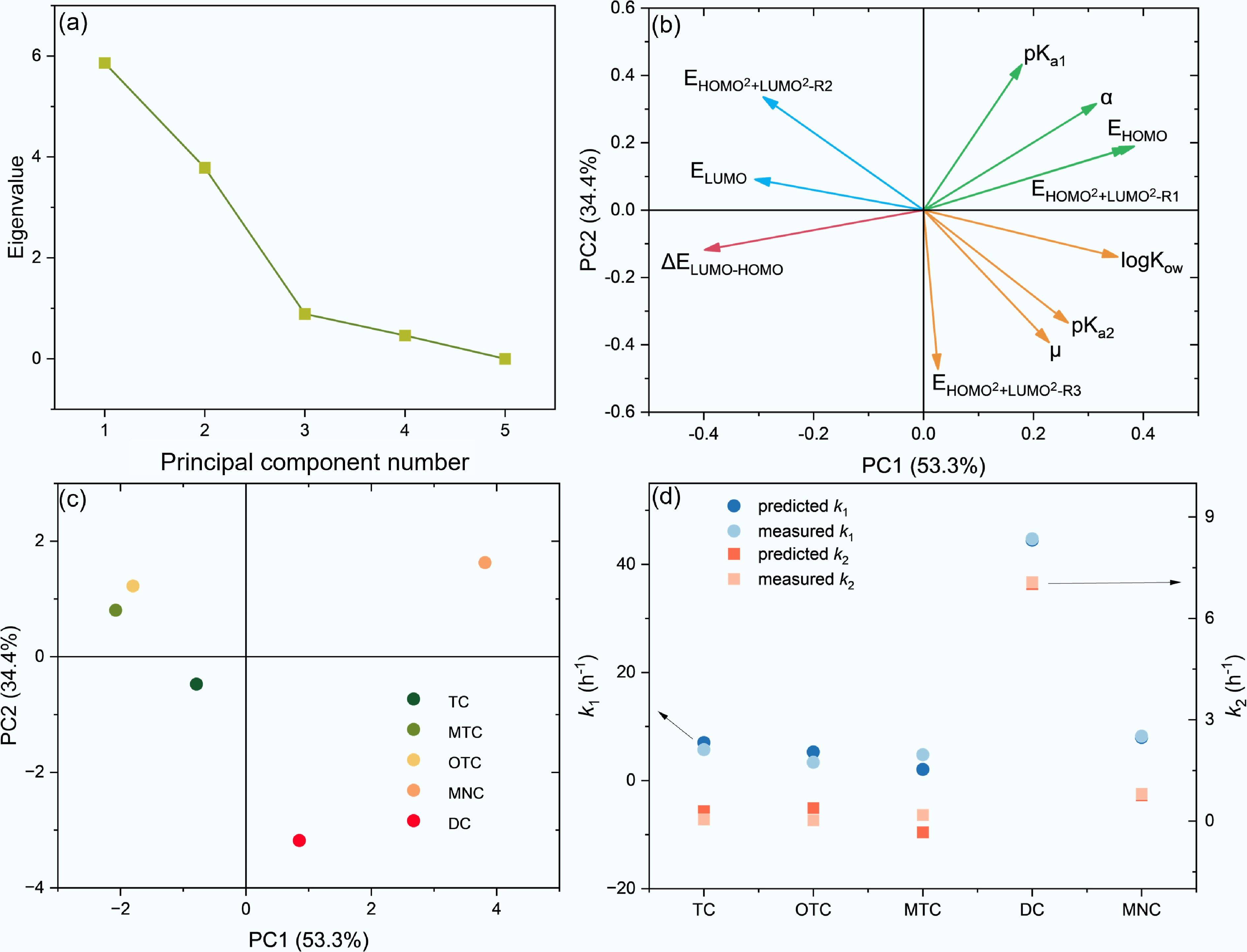 Principal component analysis (PCA) of TCs structural descriptors and multiple linear regression (MLR) of structure-adsorption rate relationships. (a) Scree plot of PC eigenvalues. (b) Loadings plot of TCs structural descriptors. (c) PC scores plot of individual TCs. (d) Comparison between measured and predicted values of TCs adsorption rate constants (k1, k2) derived from MLR models incorporating PC1, PC2, and PC3.
