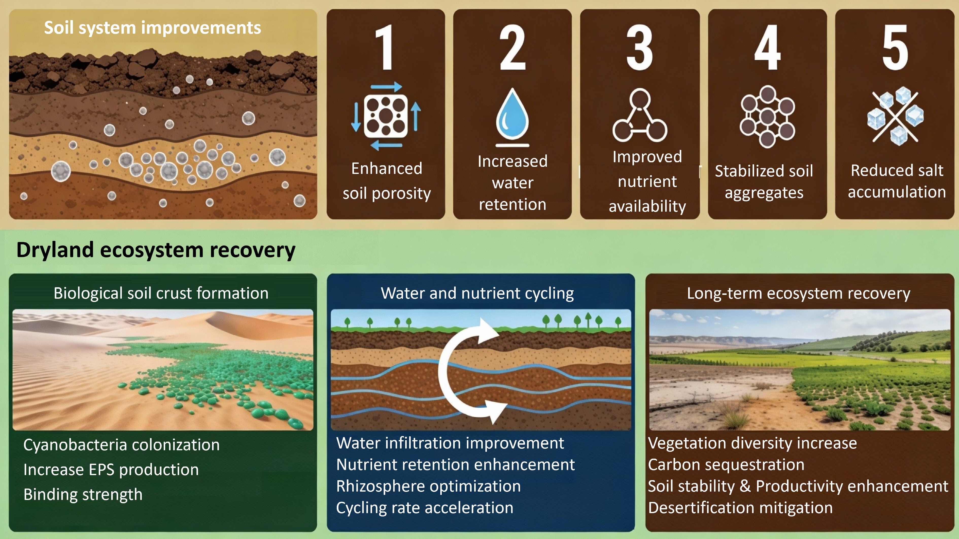 With drylands accounting for 41% of the Earth's land surface and experiencing degradation at rates approaching 12 million hectares annually, there is an urgent need for innovative restoration strategies[29]. Conventional approaches often fail due to extreme abiotic stress, particularly in hyper-arid regions. In this context, biochar offers a promising pathway by facilitating the establishment and development of biological soil crusts (BSCs)[30,31]. Through nanoscale interactions with pioneer cyanobacteria, nanobiochar can enhance exopolysaccharides (EPS) production, improve moisture retention, and help stabilize mobile sandy substrates, effectively acting as a bio-geoengineering agent.