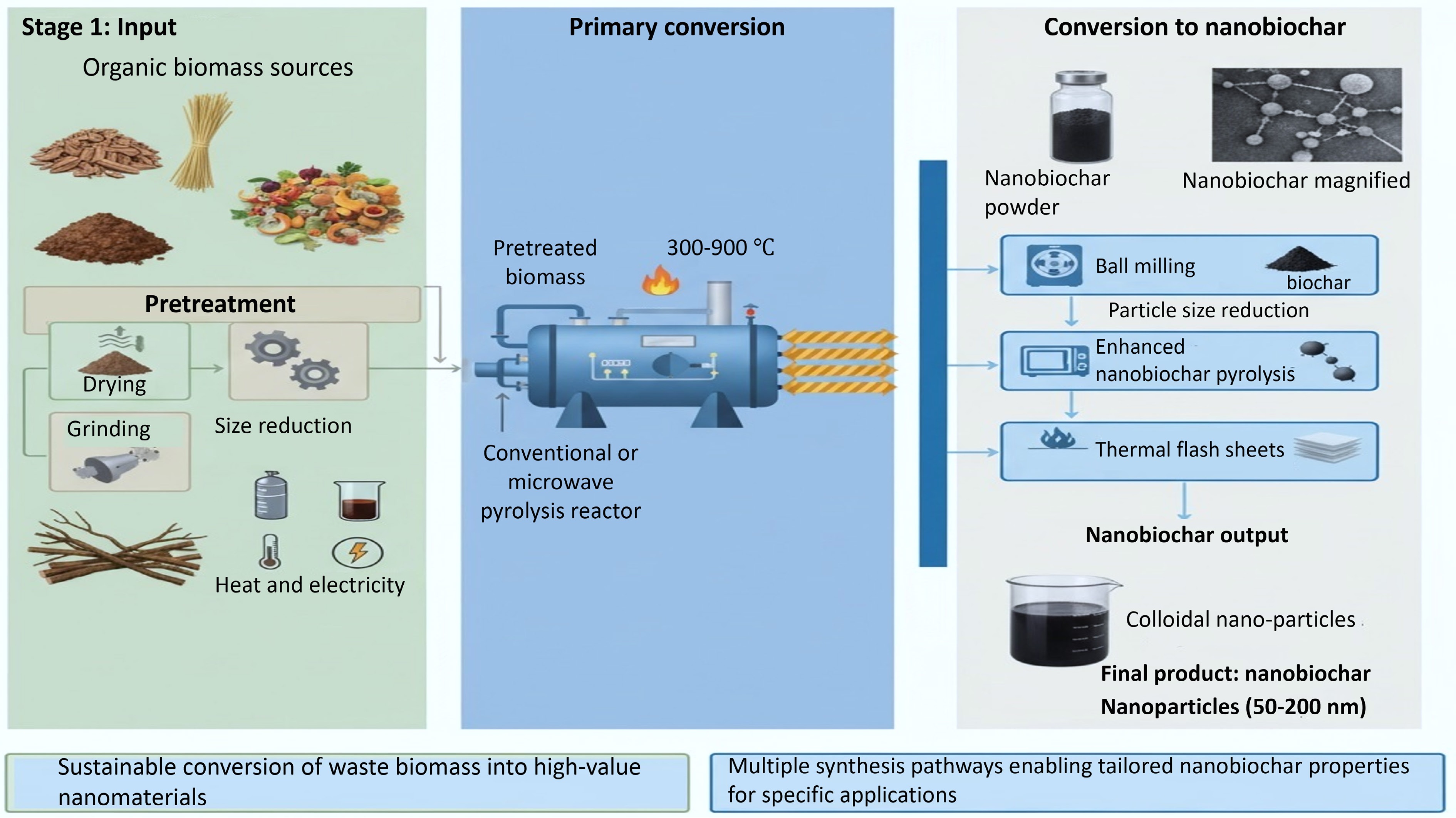 Table 1. Comprehensive comparison of nanobiochar synthesis methods: production pathways and performance metrics