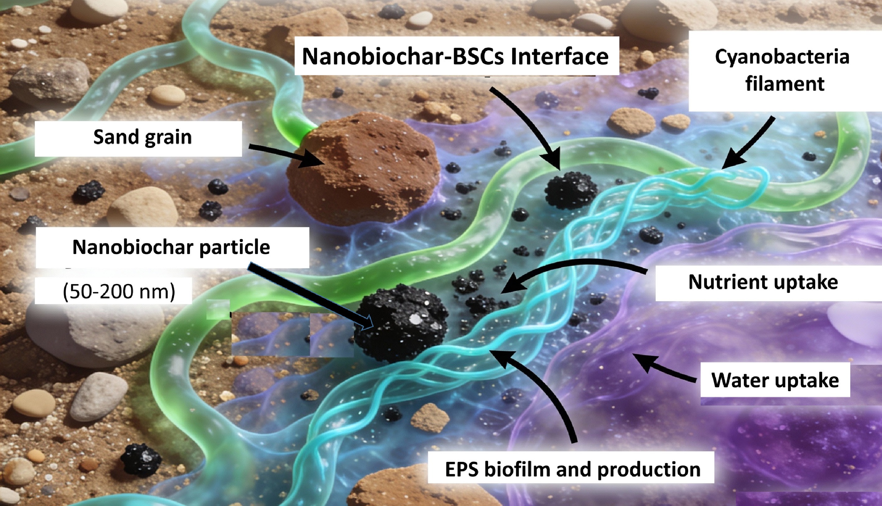 An emerging and particularly promising frontier identified in this review is the application of nanobiochar in dryland restoration, especially through its interaction with biological soil crusts. Synthesis of current studies suggests that nanobiochar can act as an effective nucleation substrate for BSC initiation, helping to overcome constraints such as wind erosion, nutrient limitation, and rapid moisture loss in arid ecosystems. By promoting cyanobacterial colonization and strengthening the physical integrity of desert surface soils, nanobiochar facilitates the development of a stable bio-composite matrix. In this context, nanobiochar transcends the role of a conventional soil amendment and emerges as a strategic tool for bio–geo-engineering, offering a scalable, nature-based approach to combating desertification and enhancing long-term soil carbon sequestration.