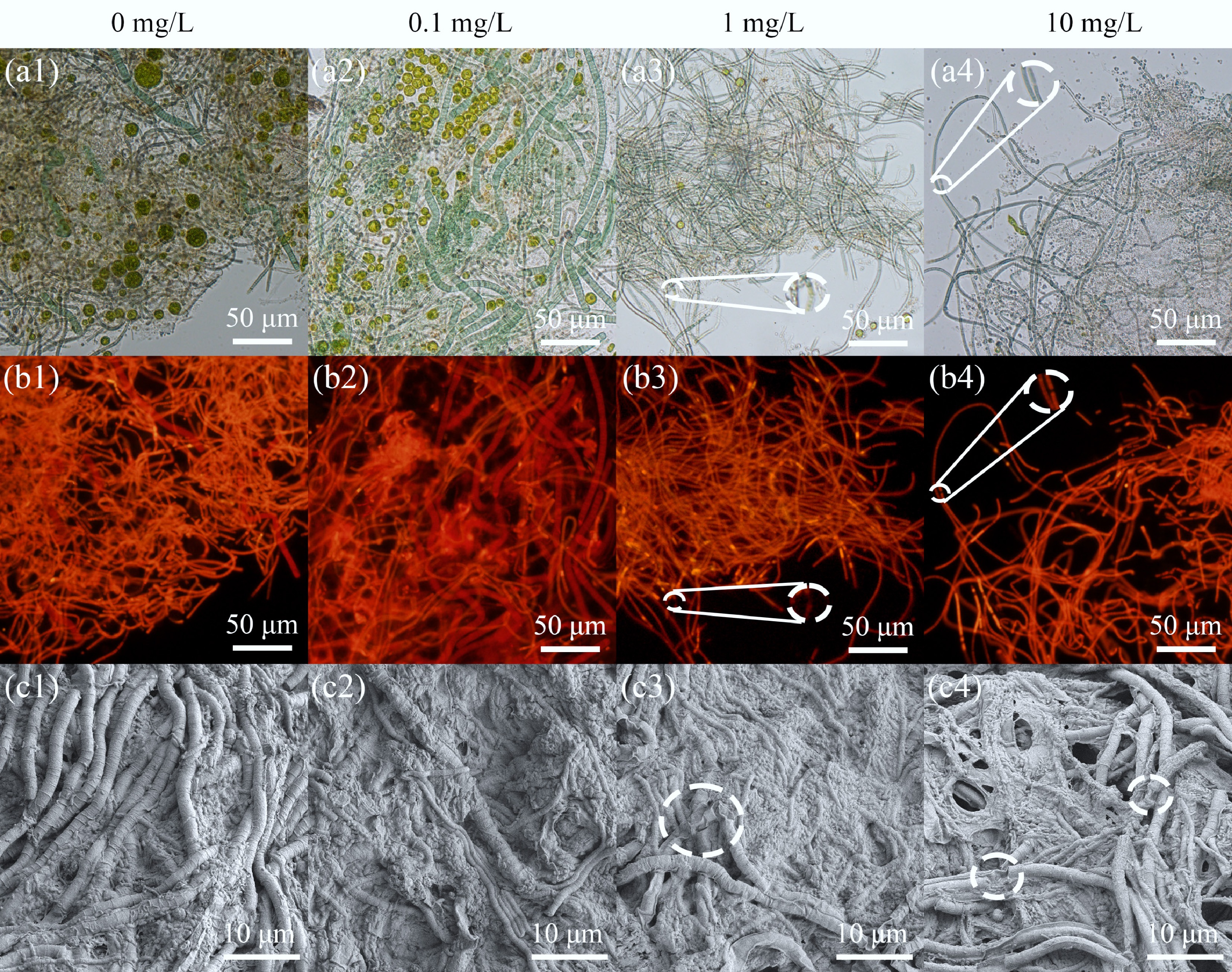 Microbial morphological characteristics of MBGS under varying estriol (E3) concentrations (0, 0.1, 1, and 10 mg/L). (a) White-light, and (b) red-light micrographs, with red autofluorescence indicating Cyanobacteria. (c) SEM images.