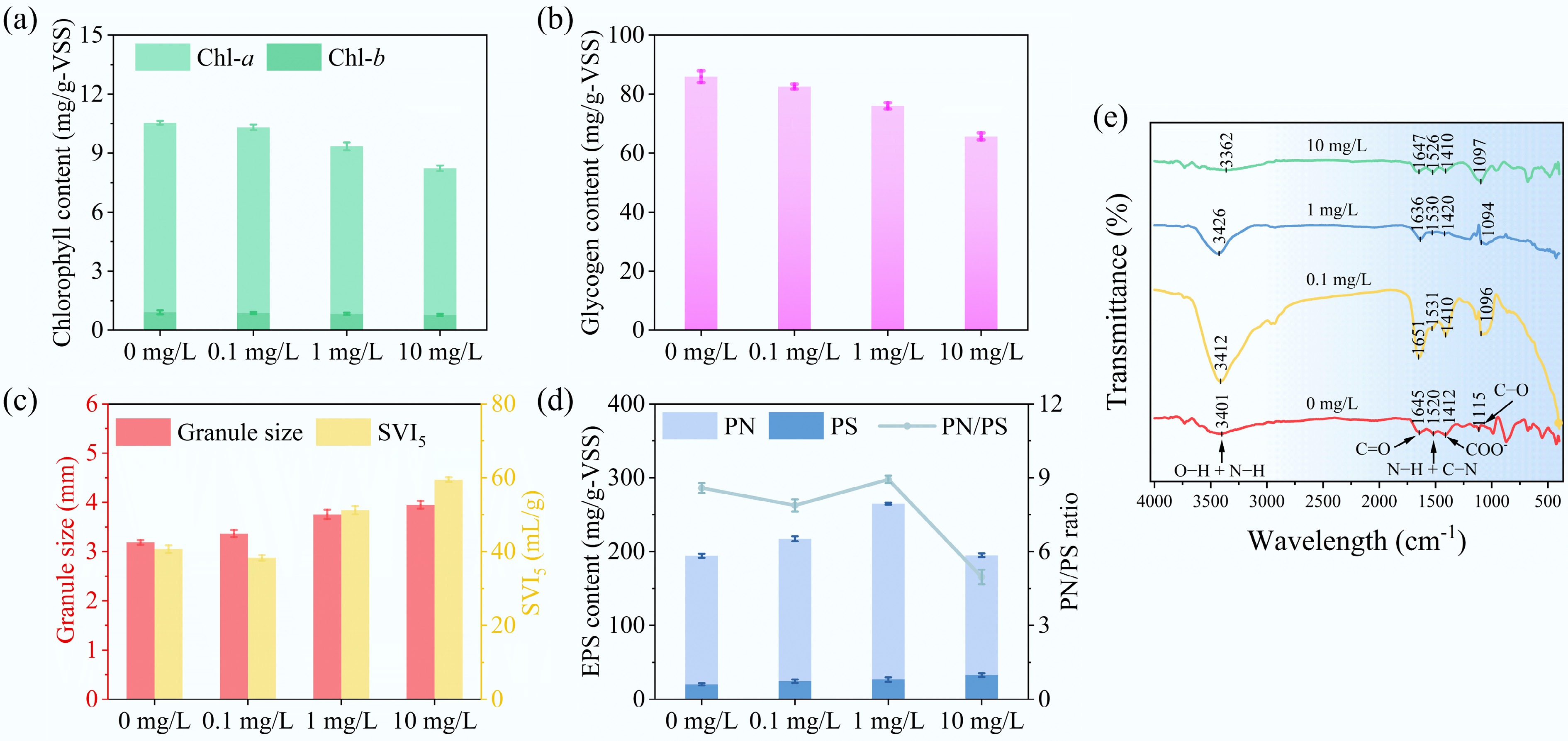 Physiological and biochemical responses of MBGS to varying estriol (E3) concentrations (0, 0.1, 1, and 10 mg/L). (a) Chl-a and Chl-b contents. (b) Glycogen content. (c) Granule size and SVI5. (d) EPS content and PN/PS ratio. (e) FT-IR spectrum of EPS.