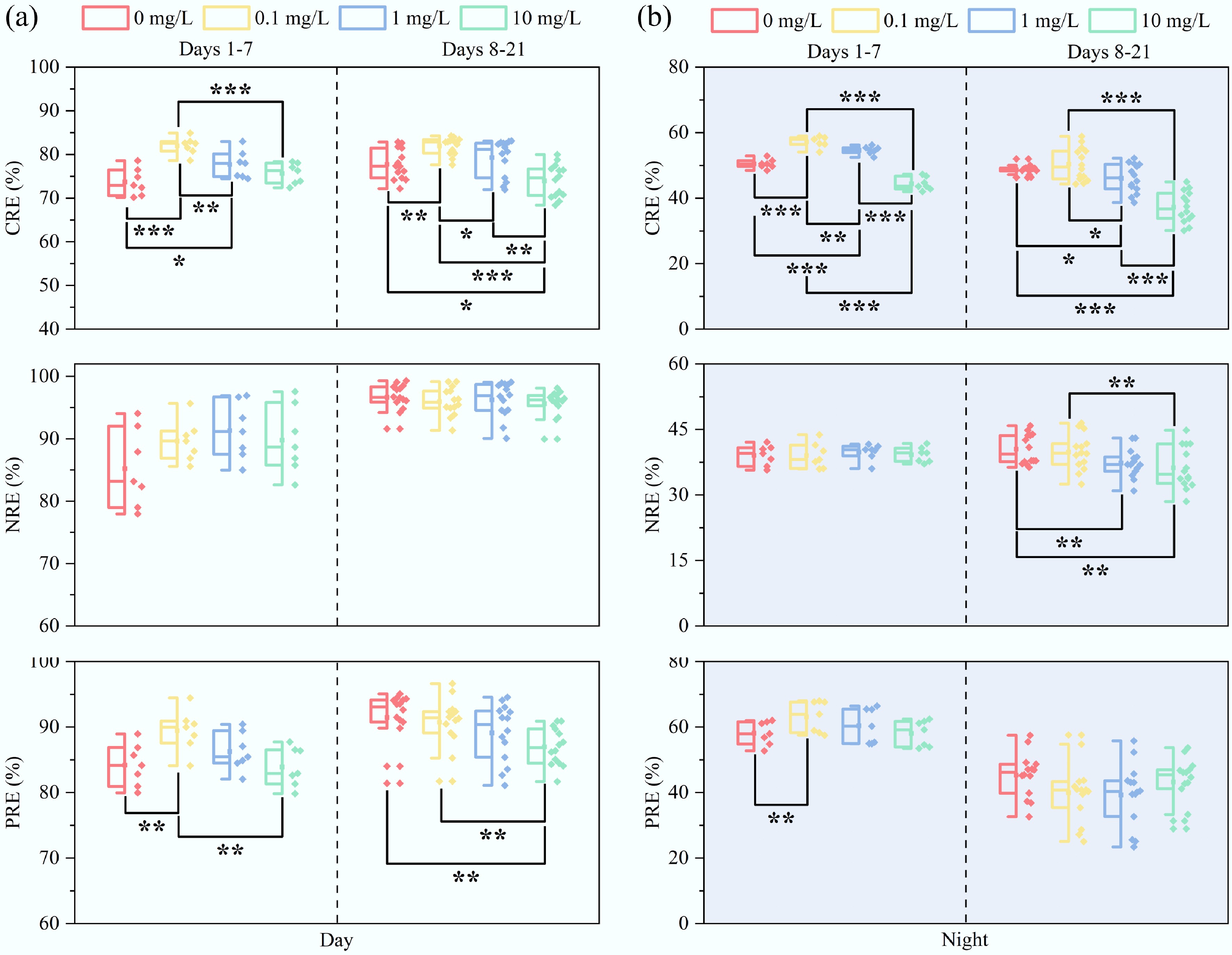 Diurnal removal performance of pollutant by MBGS under varying estriol (E3) concentrations (0, 0.1, 1, and 10 mg/L). Removal efficiencies (RE) of COD, NH4+-N, and PO43−-P during (a) daytime, and (b) nighttime. n = 7 and 14 for days 1–7, and 8–21, respectively. * p < 0.05, ** p < 0.01, and *** p < 0.001.