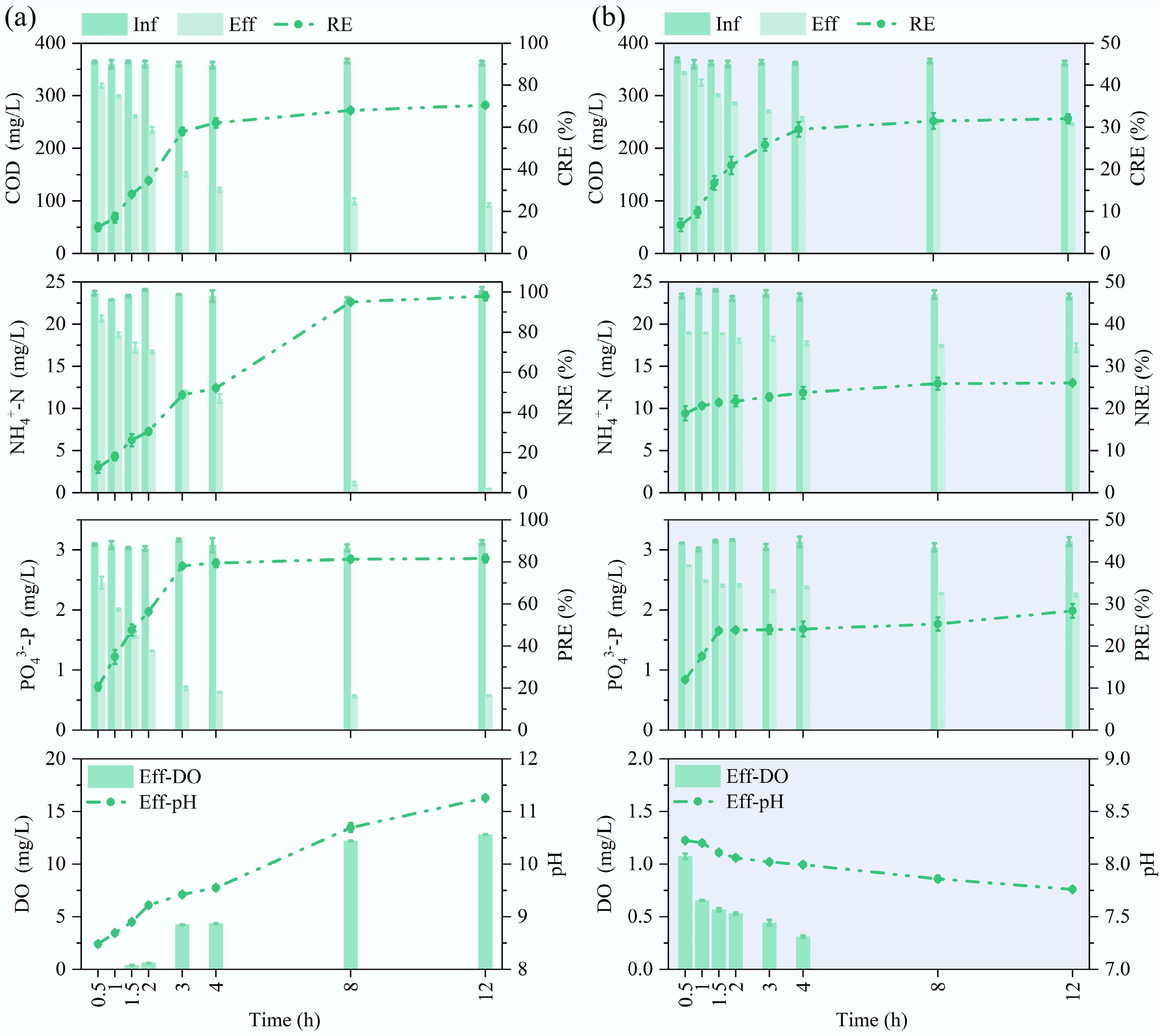 Batch removal performance of pollutants by MBGS and effluent characteristics at 10 mg/L estriol (E3) addition. Removal efficiencies (RE) of COD, NH4+-N, and PO43−-P, along with effluent DO concentration and pH value, during (a) daytime, and (b) nighttime.