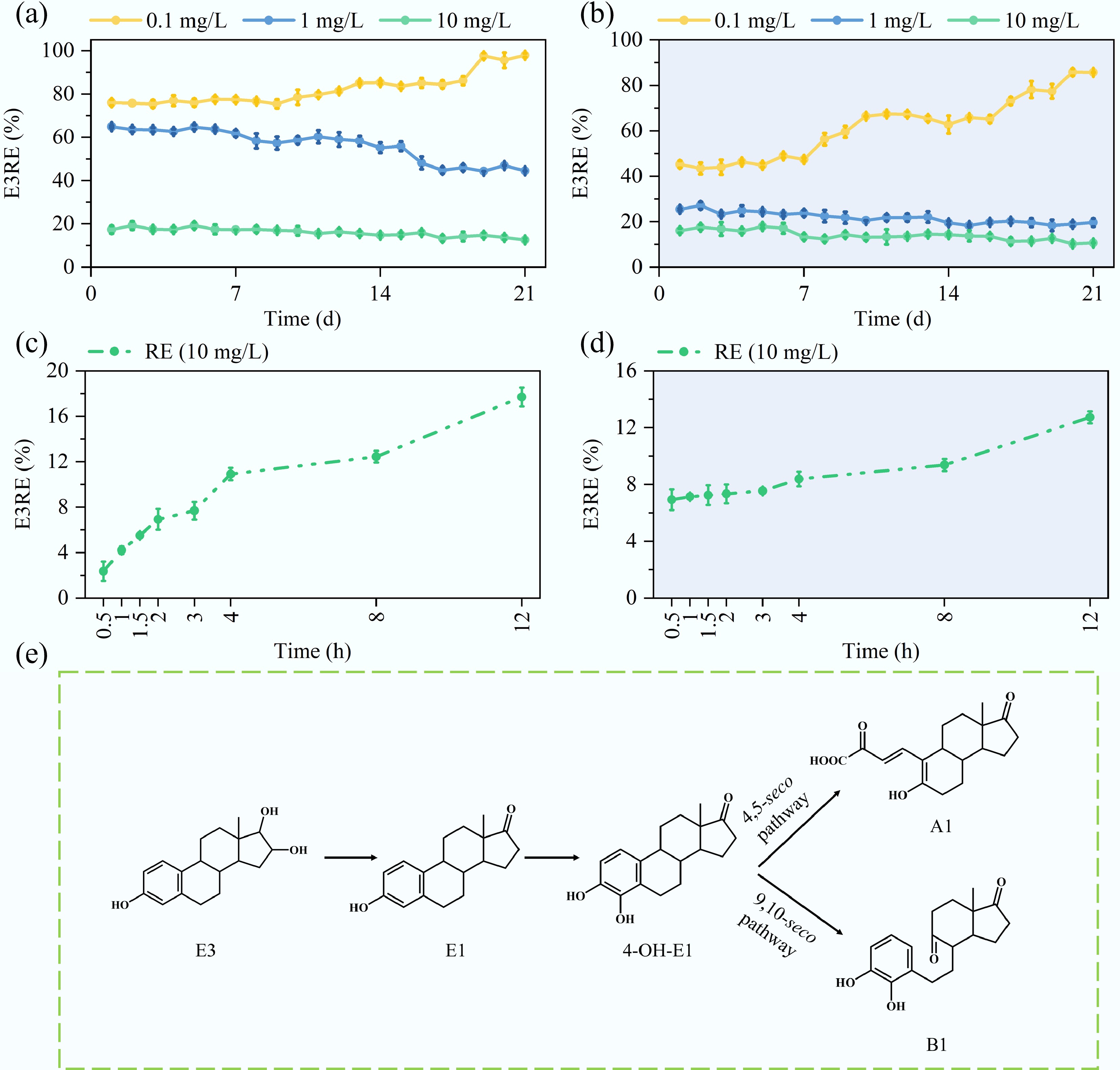 Diurnal, batch, and metabolic profiling of estriol (E3) removal by MBGS. (a), (b) Daily removal efficiencies (RE) for 0.1, 1, and 10 mg/L E3, and (c), (d) batch removal efficiencies (RE) for 10 mg/L E3 during daytime and nighttime. (e) Proposed metabolic pathways.