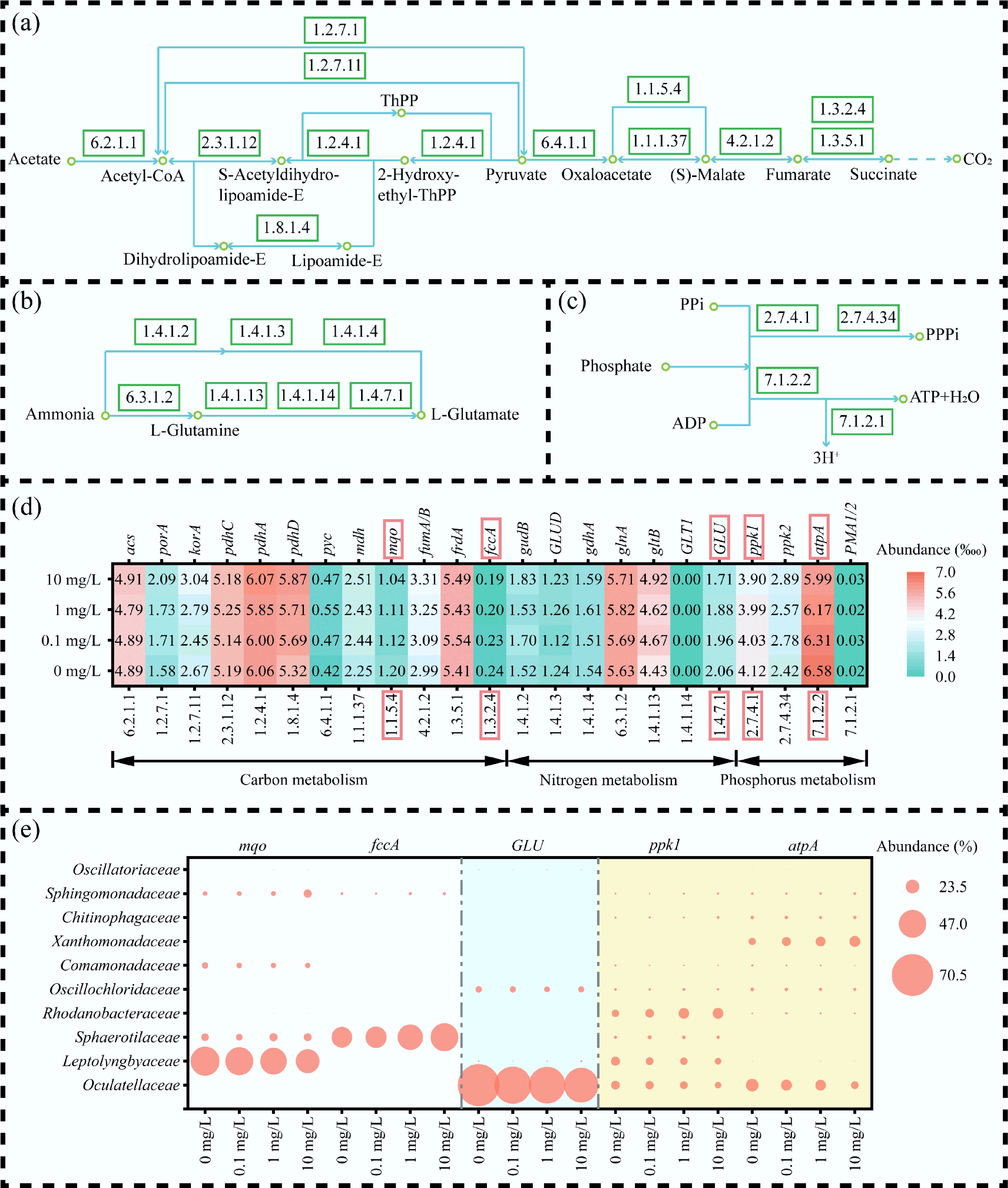 Functional metabolic response of MBGS to varying estriol (E3) concentrations across carbon, nitrogen, and phosphate pathways. (a)–(c) Metabolic pathways of carbon, nitrogen, and phosphorus, respectively. (d) Relative abundance (‱) of key functional genes, with color intensity indicating abundance level. (e) Microbial contribution (%) to functional gene, with circle size indicating contribution.
