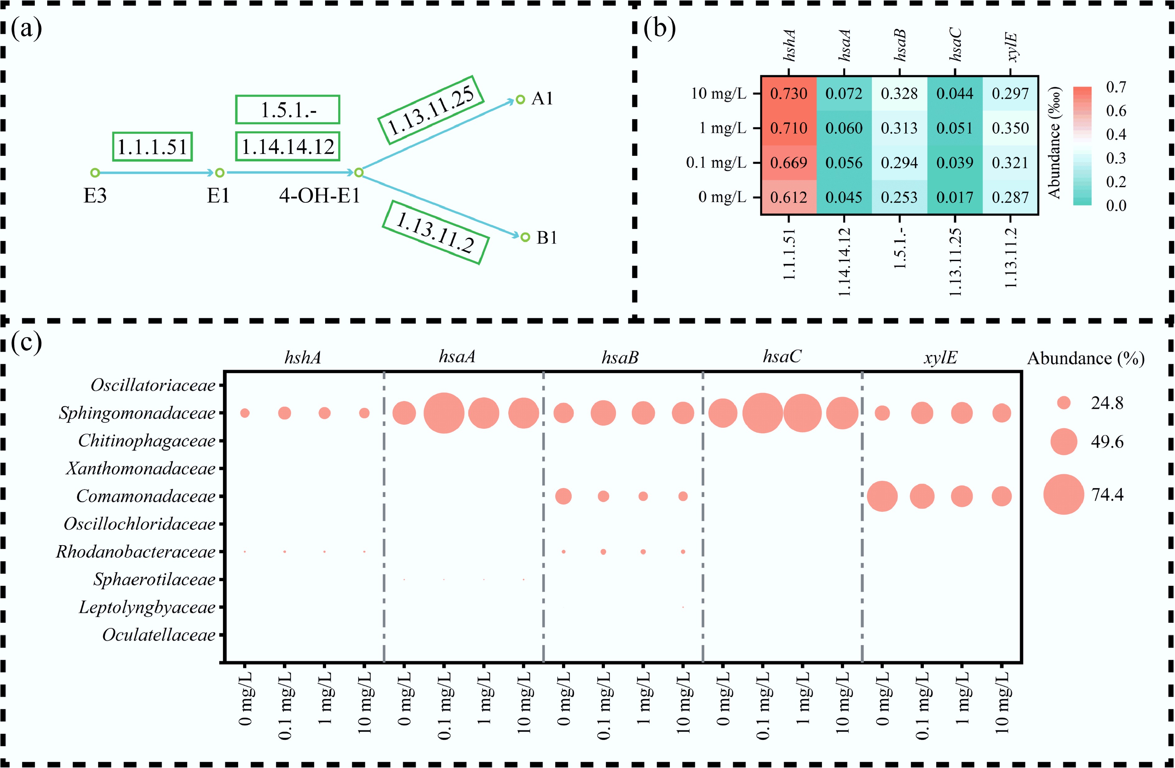 From the perspective of functional microbial contributions, Sphingomonadaceae dominated the abundance of hshA, hsaA, hsaB, and hsaC, accounting for more than 58% of hsaC at 10 mg/L, highlighting their pivotal role in aromatic ring degradation[50]. Meanwhile, Rhodanobacteraceae were mainly associated with hshA and hsaB, underscoring their importance in the initial transformation of the substrate. The superior removal efficiency observed at 0.1 mg/L aligns with the concurrent abundance peak of key functional genes contributed by these two families (Fig. 8c). Overall, the metabolic conversion of E3 into E1, 4-OH-E1, A1, and B1 was mediated by the coordinated activity of enzymes encoded by hshA, hsaA, hsaB, hsaC, and xylE, with keystone taxa including Sphingomonadaceae and Rhodanobacteraceae playing critical roles in maintaining pathway efficacy.