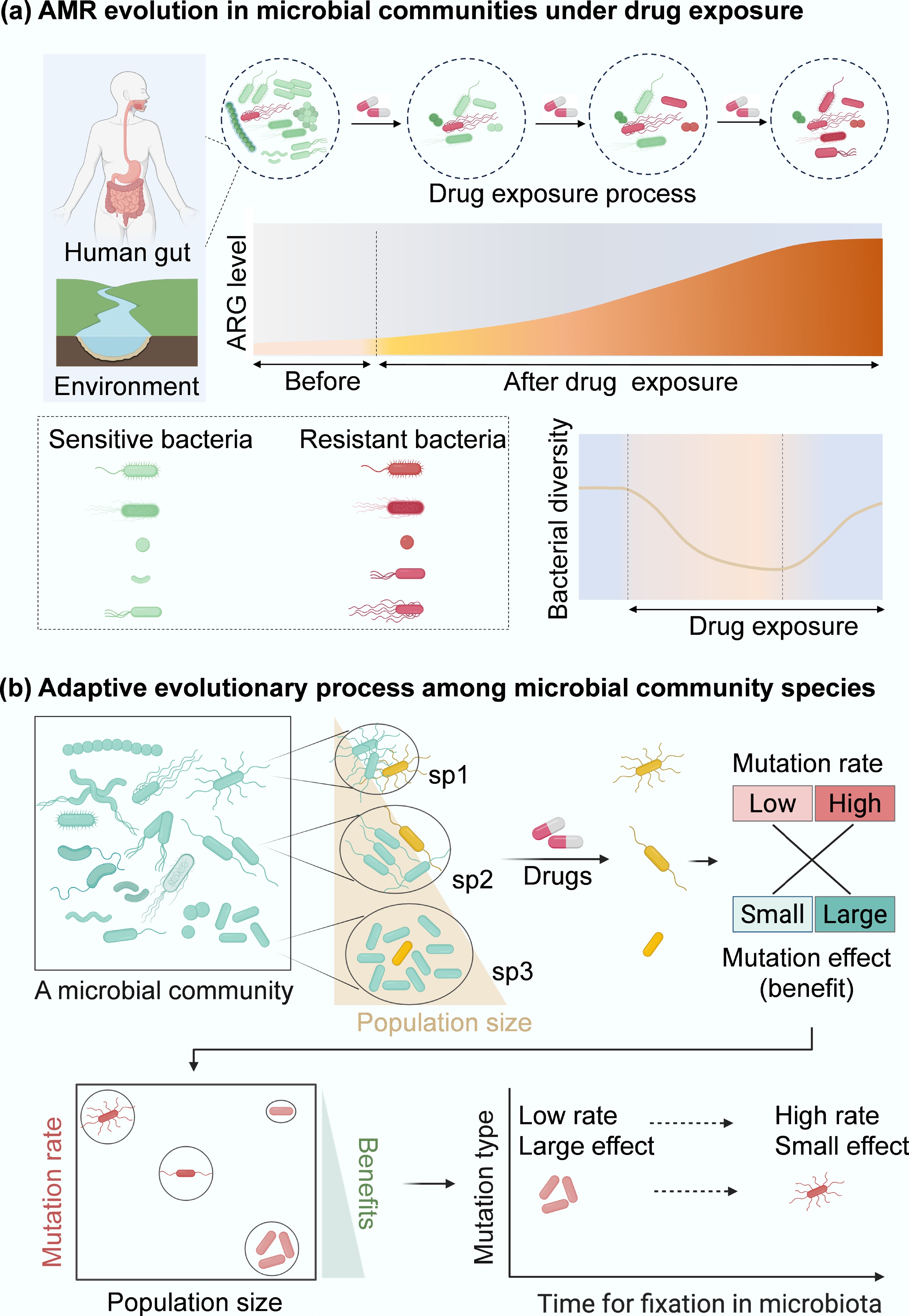 Resistance evolution of microbial community. (a) Conceptual diagram of how antibiotic exposure shapes human gut and environment microbiota and ARG profiles (red curve area). (b) Evolution paths of antibiotic resistance within microbial communities. Persisters (e.g., cells from different species, sp1, sp2, and sp3; in yellow) spontaneously occur at low frequencies in microbial communities. In communities composed of diverse species with different population sizes, the evolution of resistance becomes more complicated under drug exposure. Compared to monospecies[54], more persisters from different genotypes within a microbial community can be selected by drugs, which can subsequently induce genetic mutations (cells in red). These mutations can be grouped into low- or high-rate categories with minor or significant effects. In species with sp3, where population sizes are relatively large, large-effect mutations can be dominant because small-effect mutations are filtered out by clonal interference. In contrast, in a small population, high-rate and small-effect mutations are more likely to establish. Therefore, the low-rate, large-effect beneficial mutations from sp3 can be more easily fixed in microbial communities than mutations from other species populations (sp1, sp2). These mutations drive bacterial adaptive evolution and will promote the development of antibiotic resistance within a microbial community.