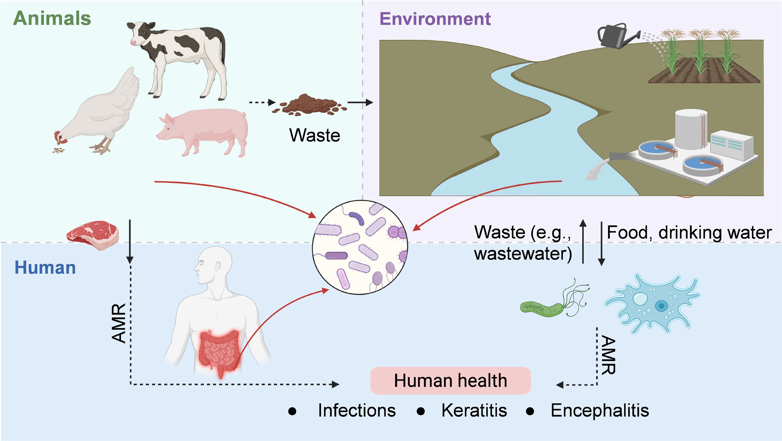 The dynamic exchange of resistant microbes and genes across humans, animals, and the environment underscores AMR as a global One Health crisis. Addressing this challenge requires integrated surveillance networks, reduction of non-essential antimicrobial use across sectors, improved waste and water management, and international policy coordination. Without cross-sectoral action, the world risks a post-antibiotic era where resistance within complex microbiomes threatens health security, food systems, and environmental sustainability.