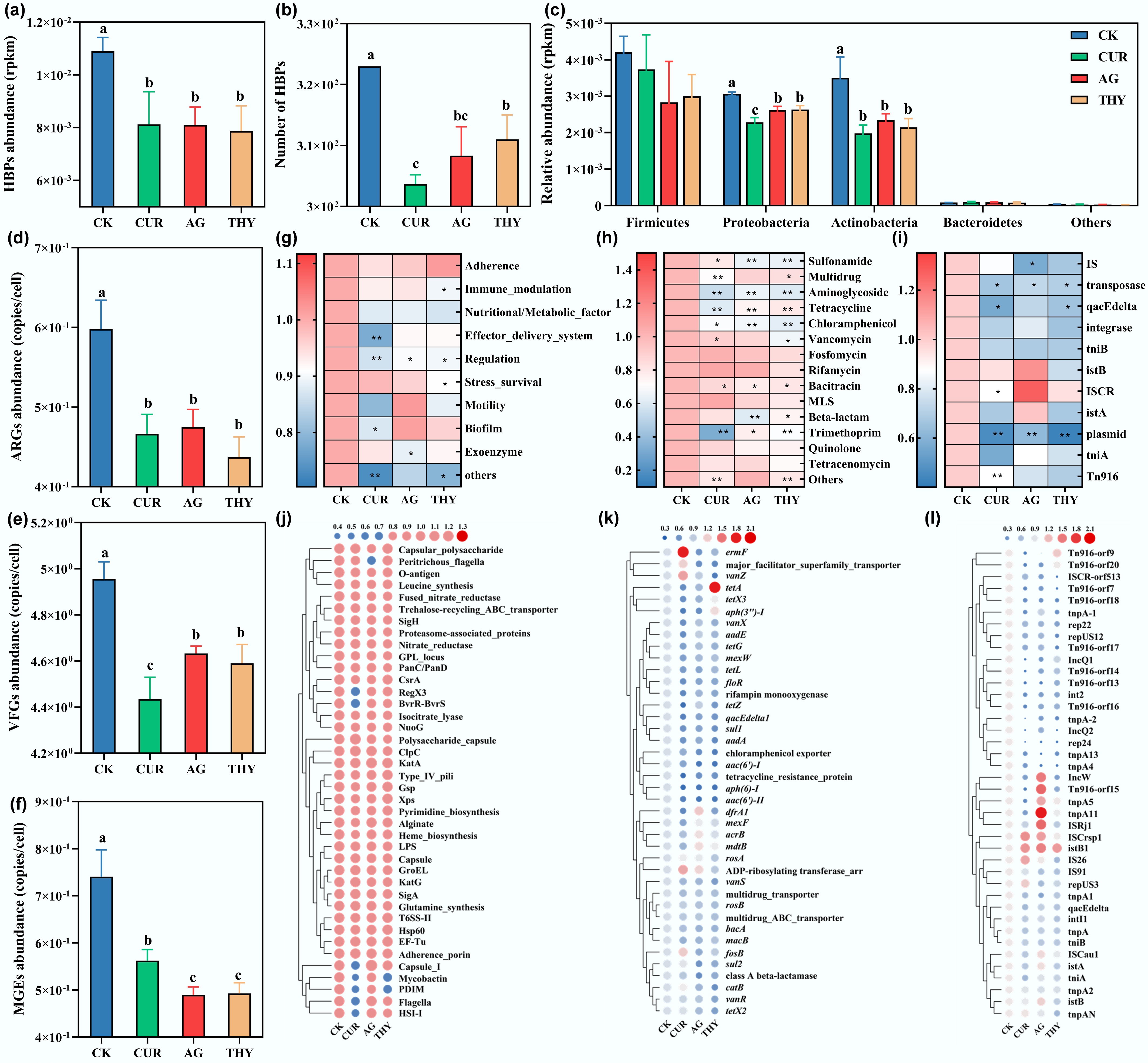 Effects of plant extracts on the relative abundance and risk of HBPs in soil. (a) Total abundance, and (b) number of HBPs in soil treated with CUR, AG, and THY. (c) Effects of CUR, AG, and THY on the major bacterial phylum of HBPs. The total abundance of (d) ARGs, (e) MGEs, and (f) VFGs in soil treated with plant extracts. Effects of CUR, AG, and THY on the main categories of (g) ARGs, (h) MGEs, and (i) VFGs. The abundance of the top 40 subclasses of (j) ARGs, (k) MGEs, and (l) VFGs in soil treated with plant extracts. Data points with the same letter suggest no significant difference (p > 0.05).
