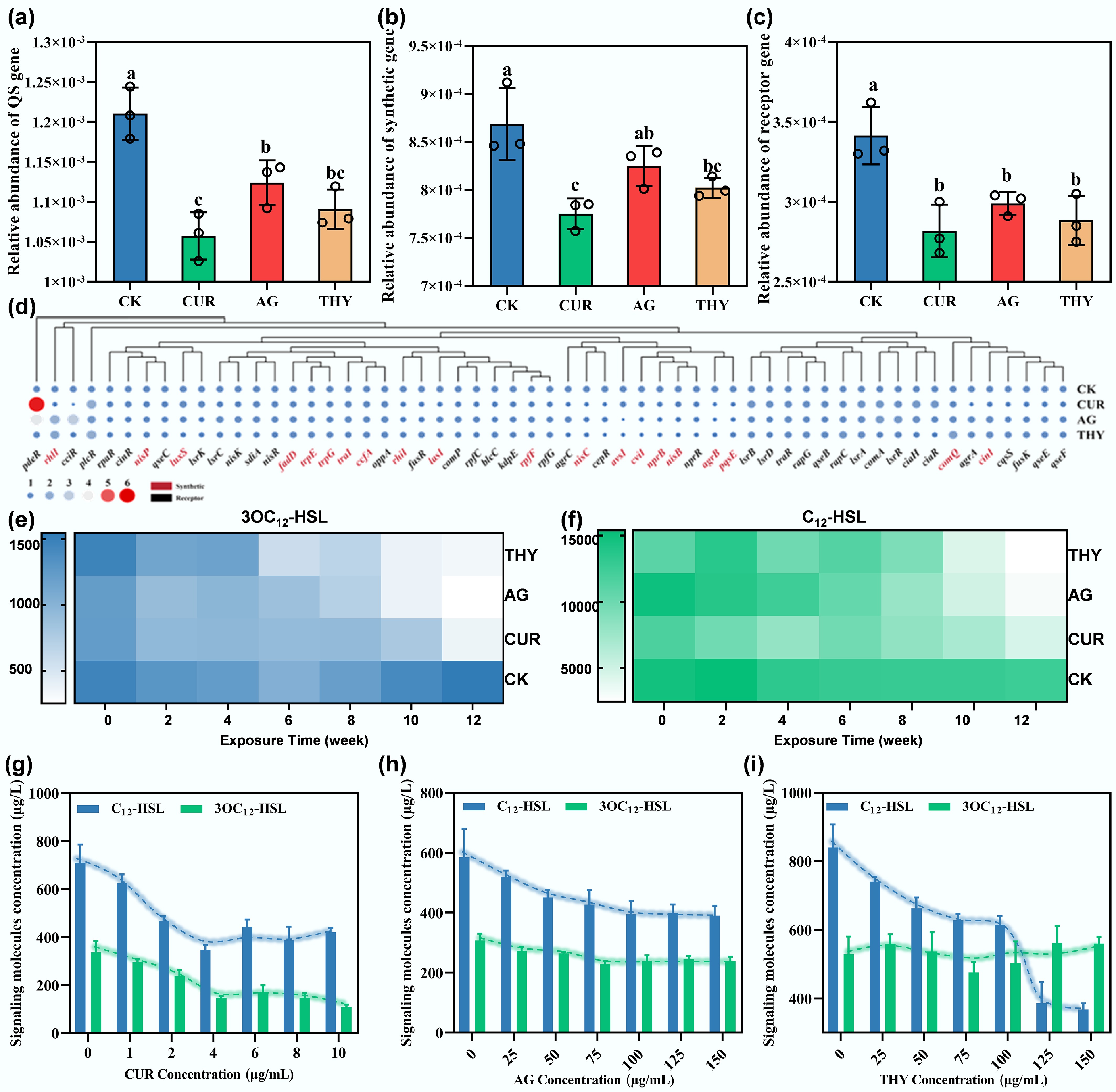 Effects of plant extracts on the QS of HBPs in soil. Changes in the abundance of (a) total QS genes, (b) QS-related synthetic genes, and (c) QS-related receptor genes in the soil after application of different types of plant extracts. Different lowercase letters indicate significant differences among the treatments at p < 0.05. (d) Effects of plant extracts on soil-specific QS-related genes. Effect of plant extracts on the concentrations of (e) 3OC12-HSL, and (f) C12-HSL in the soil microcosms at different incubation times. Effects of different concentrations of (g) CUR, (h) AG, and (i) THY on the secretion of signaling molecules by PAO1.