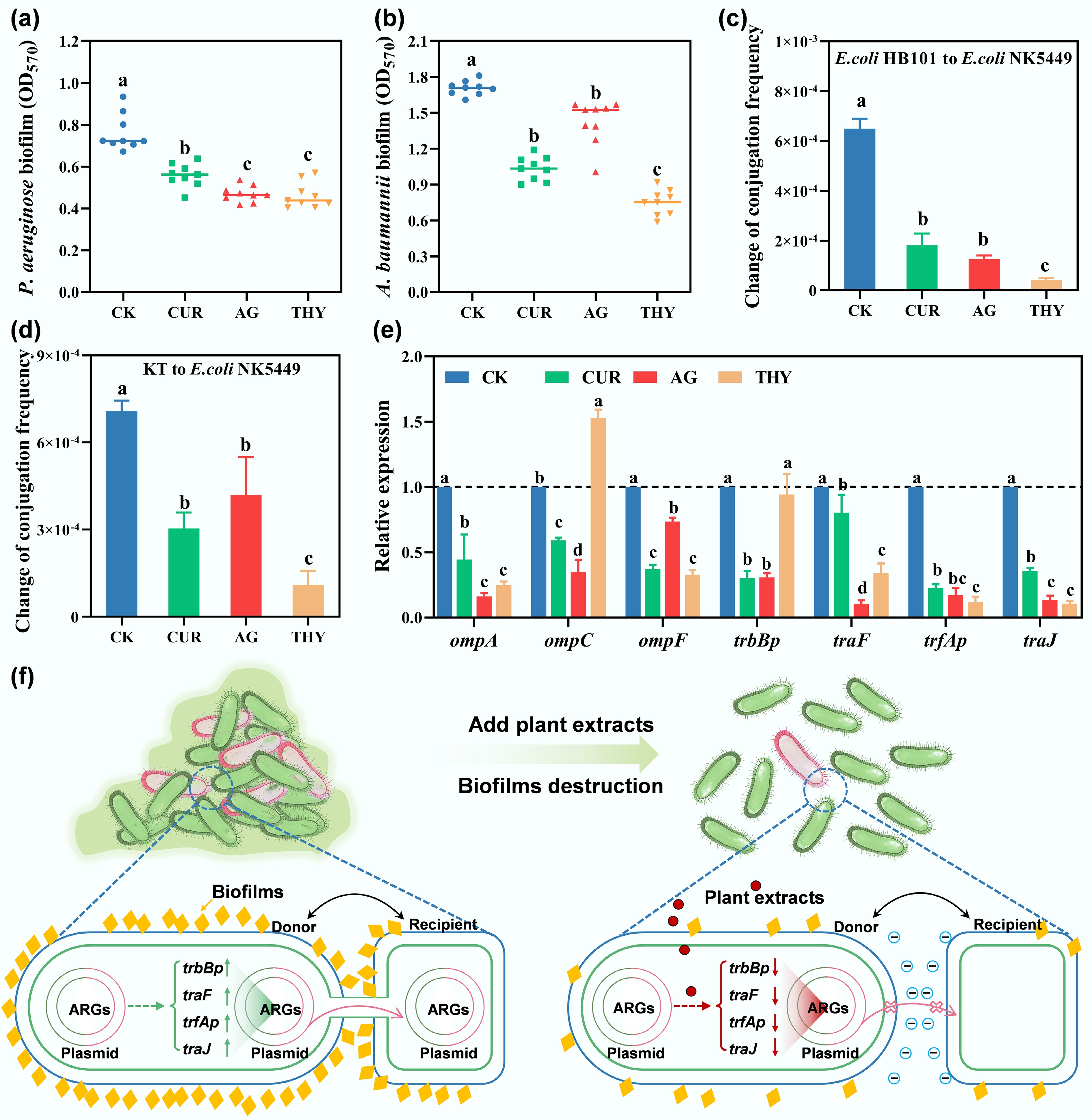 Effects of different plant extracts on the formation of biofilms of (a) PAO1 and (b) Acinetobacter baumannii (A. baumannii). Effects of plant extracts on (c) the intra-species, (d) inter-species transfer conjugation frequencies, and (e) genes associated with conjugative transfer. Data points with the same letter indicate no significant difference (p > 0.05). (f) Illustrative diagrams for the inhibition of the conjugative transfer of ARGs and VFGs with the addition of plant extracts.