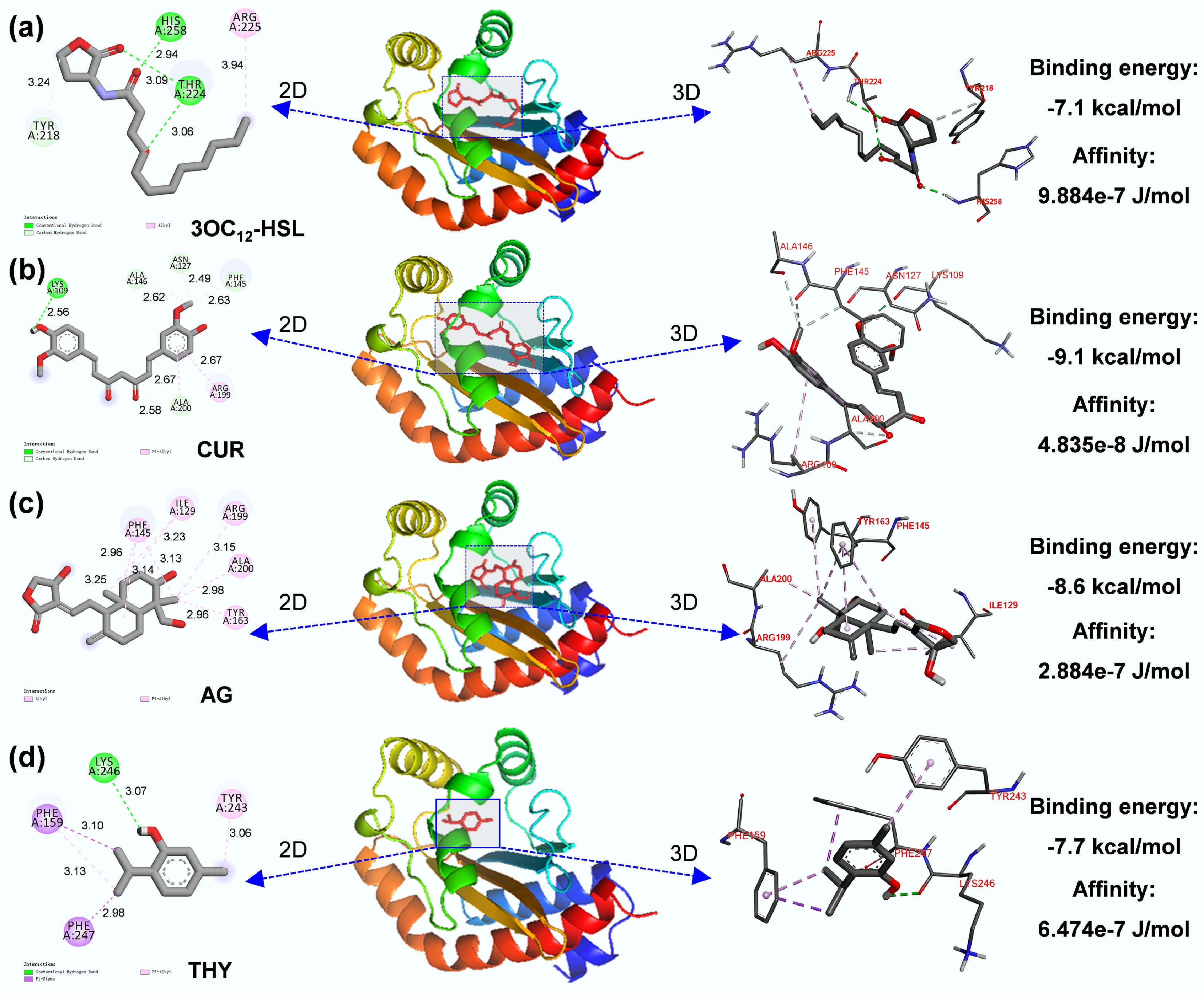 Molecular docking predicted amino acid sites for the binding of (a) 3OC12-HSL, (b) CUR, (c) AG, and (d) THY and LasR protein.