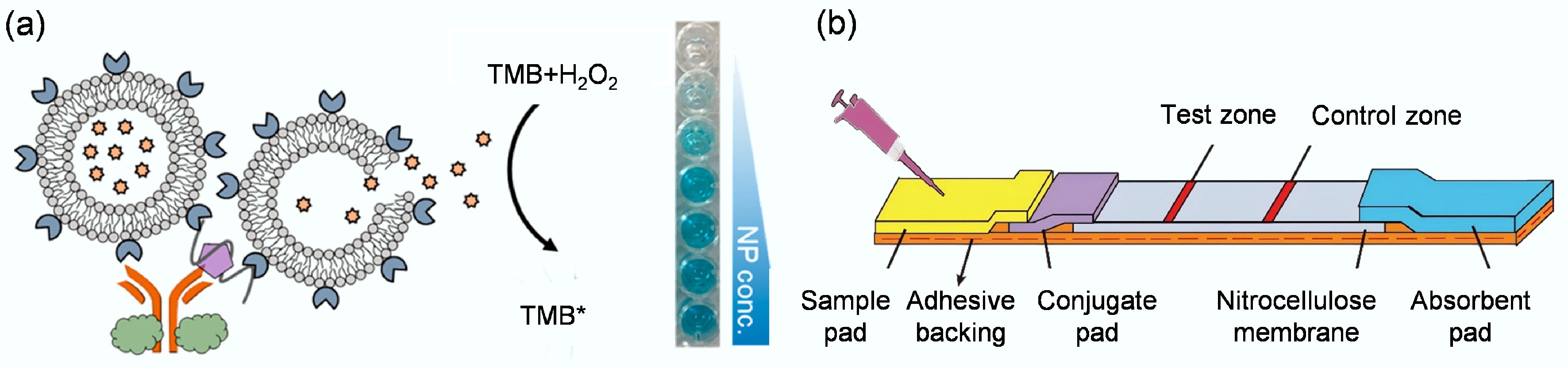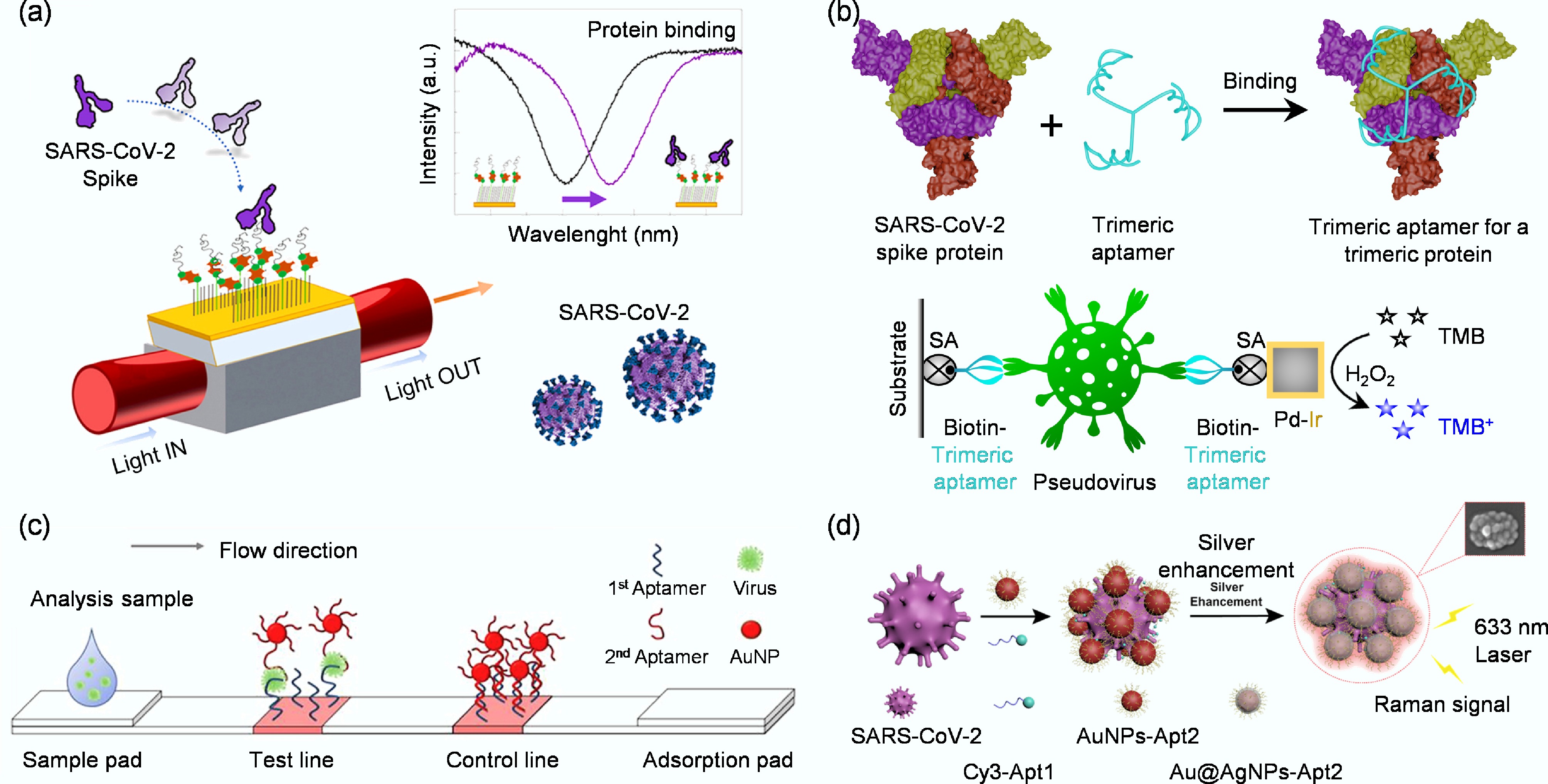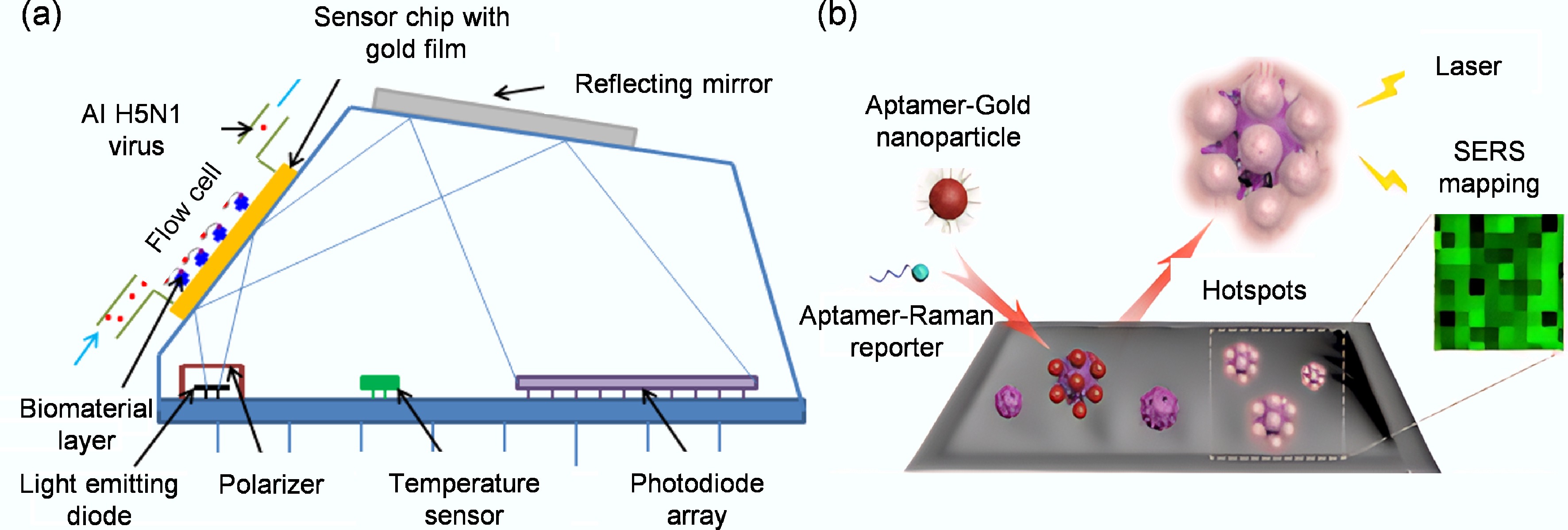 (a) Measurement of avian influenza virus configuration using a portable SPR aptamer biosensor[97]. (b) Schematic diagram of the configuration of lateral flow analysis based on SERS[36].