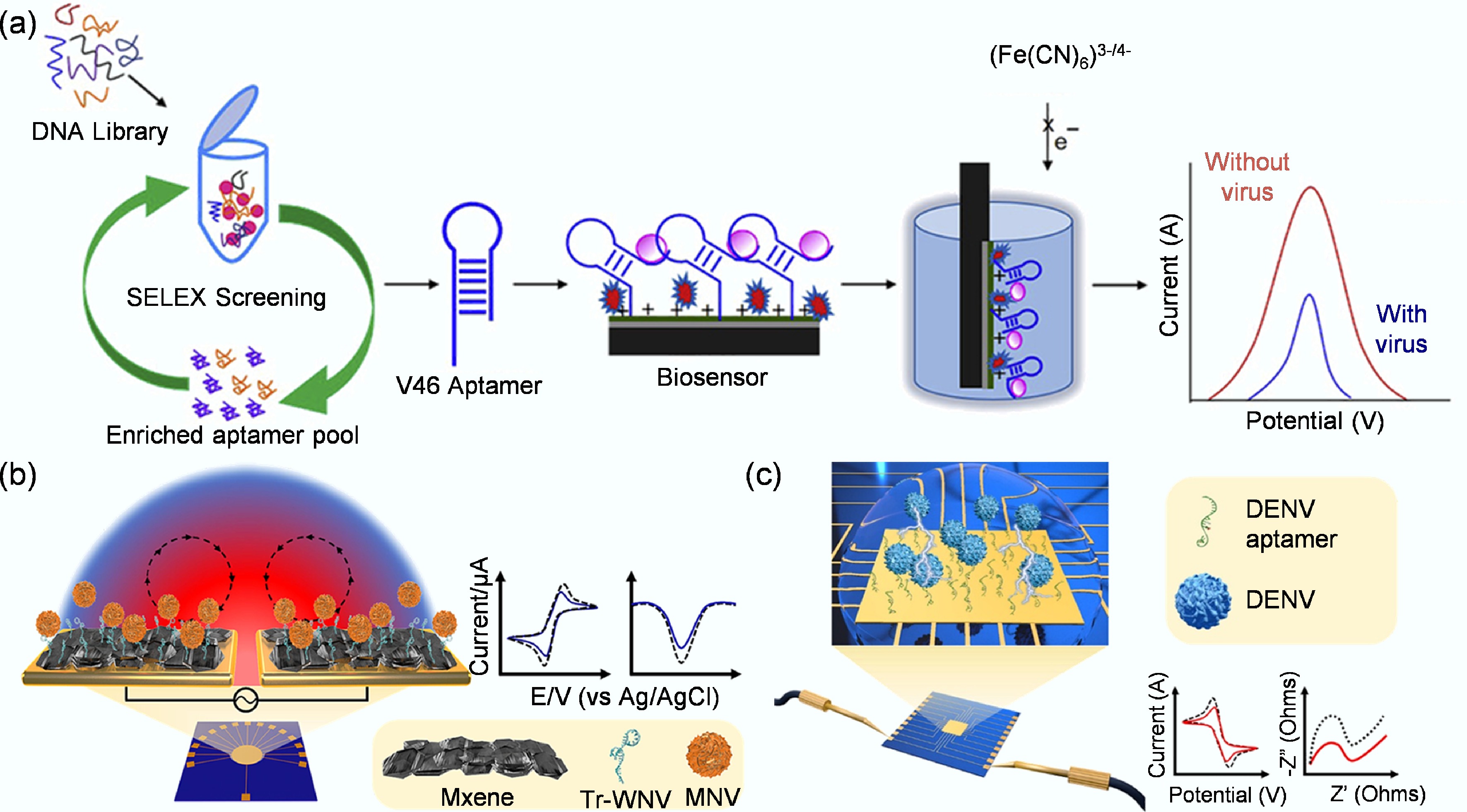(a) Label-free electrochemical aptamer biosensor based on differential pulsed voltammetry for the detection of H1N1 virus[99]. (b) Schematic representation of a rapid electrochemical biosensor for West Nile virus detection, featuring an MXene/Tr-WNV aptamer complex and fabricated by ACEF technology[75]. (c) Schematic representation of a biosensor for rapid electrochemical dengue virus detection by ACEF technology[76].