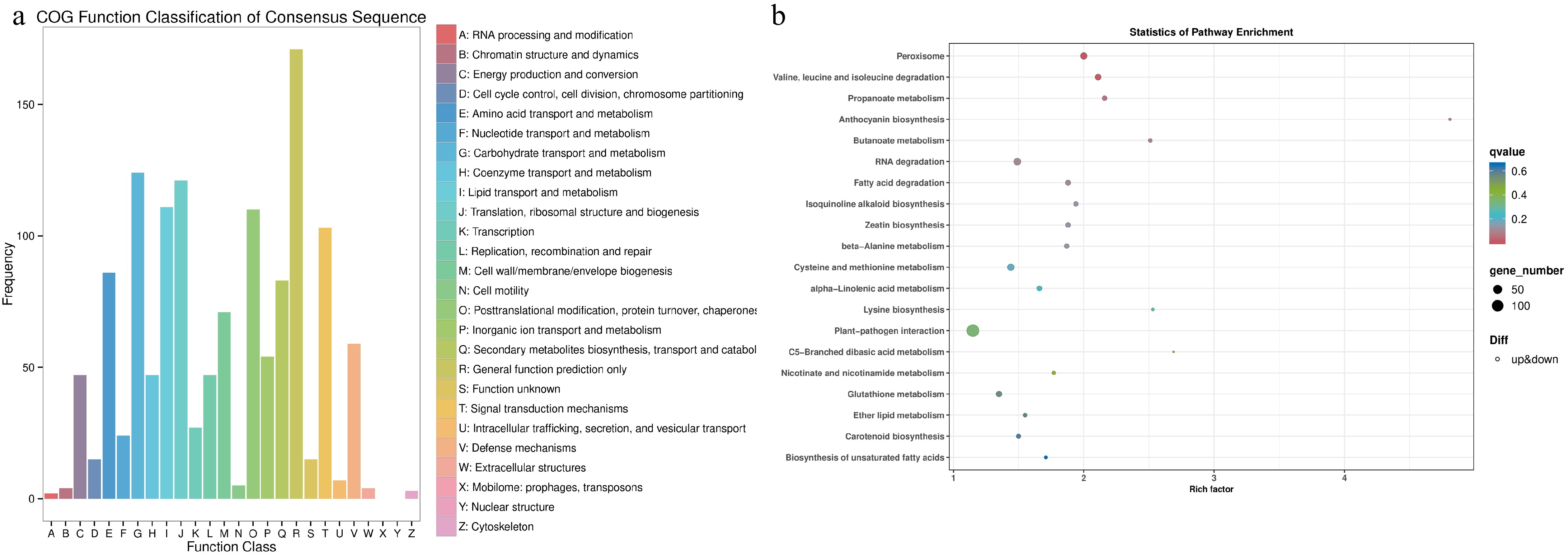 Functional annotation of differentially expressed genes (DEGs) in tea plants grown in monoculture and intercropped with peas. (a) COG functional classification of DEGs. (b) Enrichment analysis of KEGG pathways for DEGs. A lower q-value signifies a higher degree of enrichment.