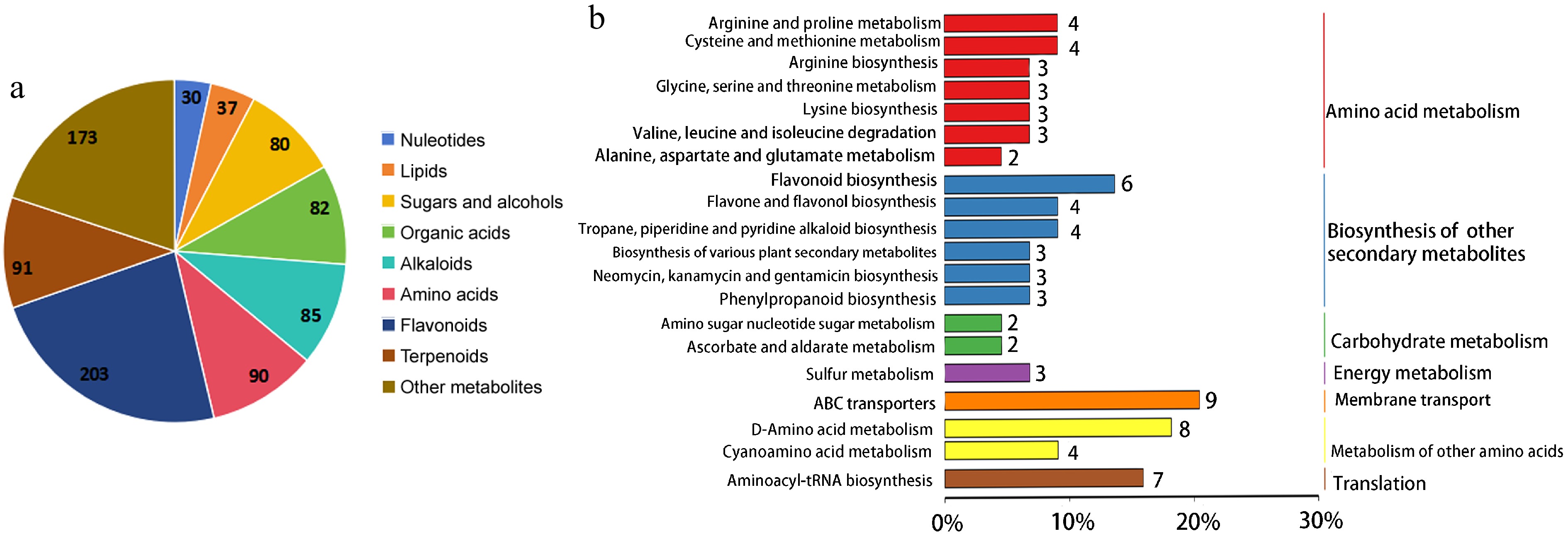 Metabolites functional annotation and classification analysis. (a) All the identified metabolites classification of tea plants. (b) KEGG pathway annotation of differential metabolites between mono- and trifolium-intercropped tea plants.