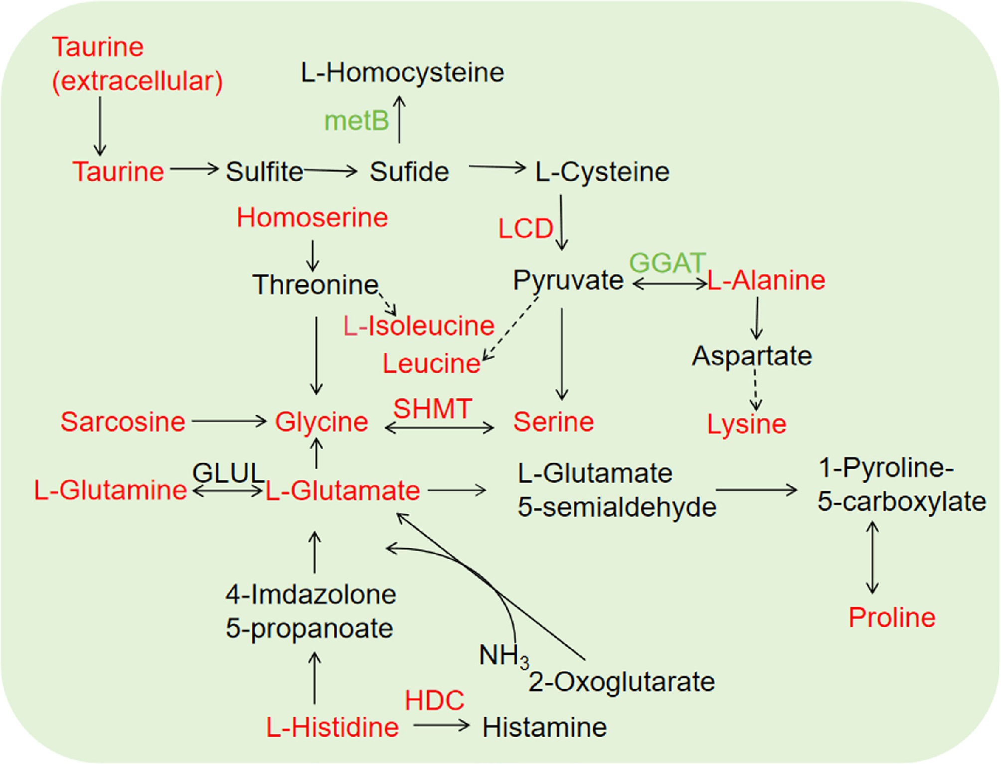 Amino acid metabolism in tea plants intercropped with trifolium. Red and green indicate upregulated and downregulated genes/metabolites, respectively. Solid line and dotted line represent direct and indirect reactions, respectively.