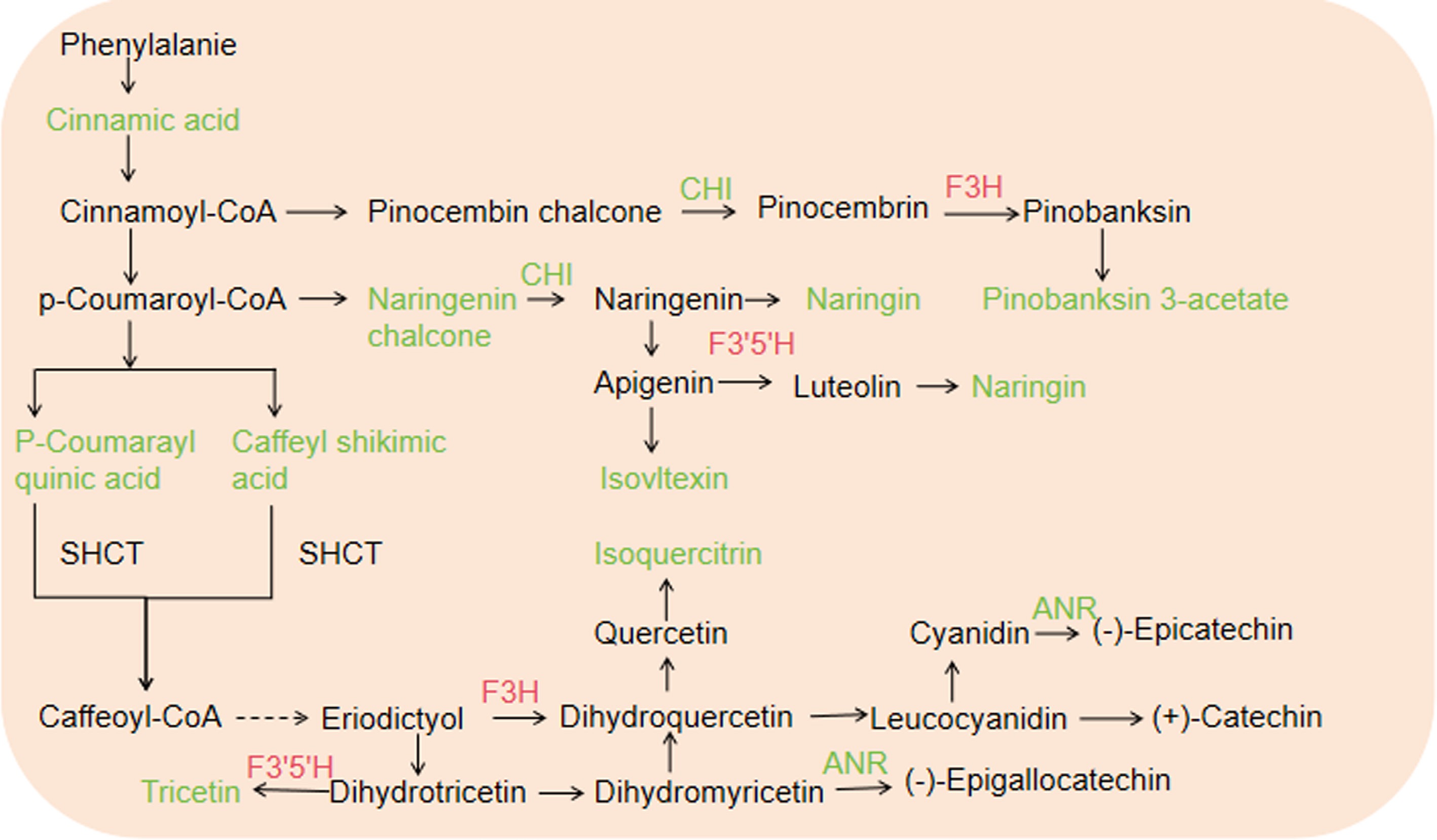 Flavonoid metabolism in tea plants intercropped with trifolium. Red and green indicate upregulated and downregulated genes or metabolites, respectively. The solid line and dotted line represent direct and indirect reactions, repectively.