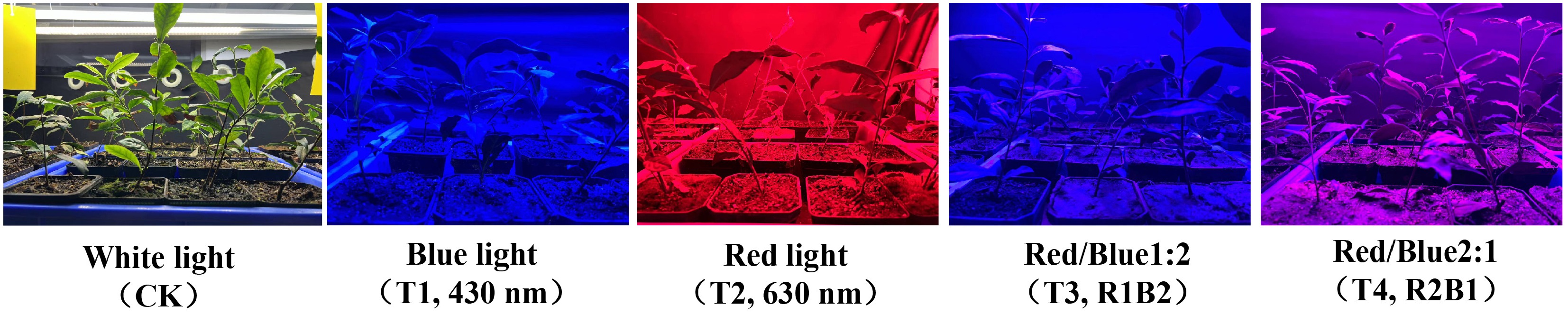 • The experimental material selected was 1-year-old 'Baojing Huangjincha 1', provided by Huangjin Village, Baojing County, Hunan Province, China (28°26'41.96" N, 109°46'34.87" E). The specimens were maintained under a regimen with a controlled photoperiod (12 h light/dark) for 30 d with white LED illumination delivering 150 μmol/m2/s as part of the acclimation process. The humidity and temperature in the plant optics laboratory were maintained at 70 ± 5% and 20 ± 5 °C, respectively. We maintained a consistent light intensity by keeping the light source 20–30 cm away from the plant. After 30 d, the tea seedlings were transferred to grow under blue light (T1, peak at 430 nm), red light (T2, peak at 630 nm), blue : red = 2:1 (T3, R1B2), and red : blue = 2:1 (T4, R2B1) LEDs for 30 d; white light (CK) was used as the control group (Fig. 1) The LEDs were provided by Dongguan Ledstar Optoelectronic Technology Co., Ltd. (T5-fluorescent tubes, 18 W), the light period was 12 h/d, the intensity was 150 μmol/m2/s, and other environmental factors remained unchanged. Then fresh samples of one bud and two leaves were sampled and stored at −80 °C, and each group was sampled three times.