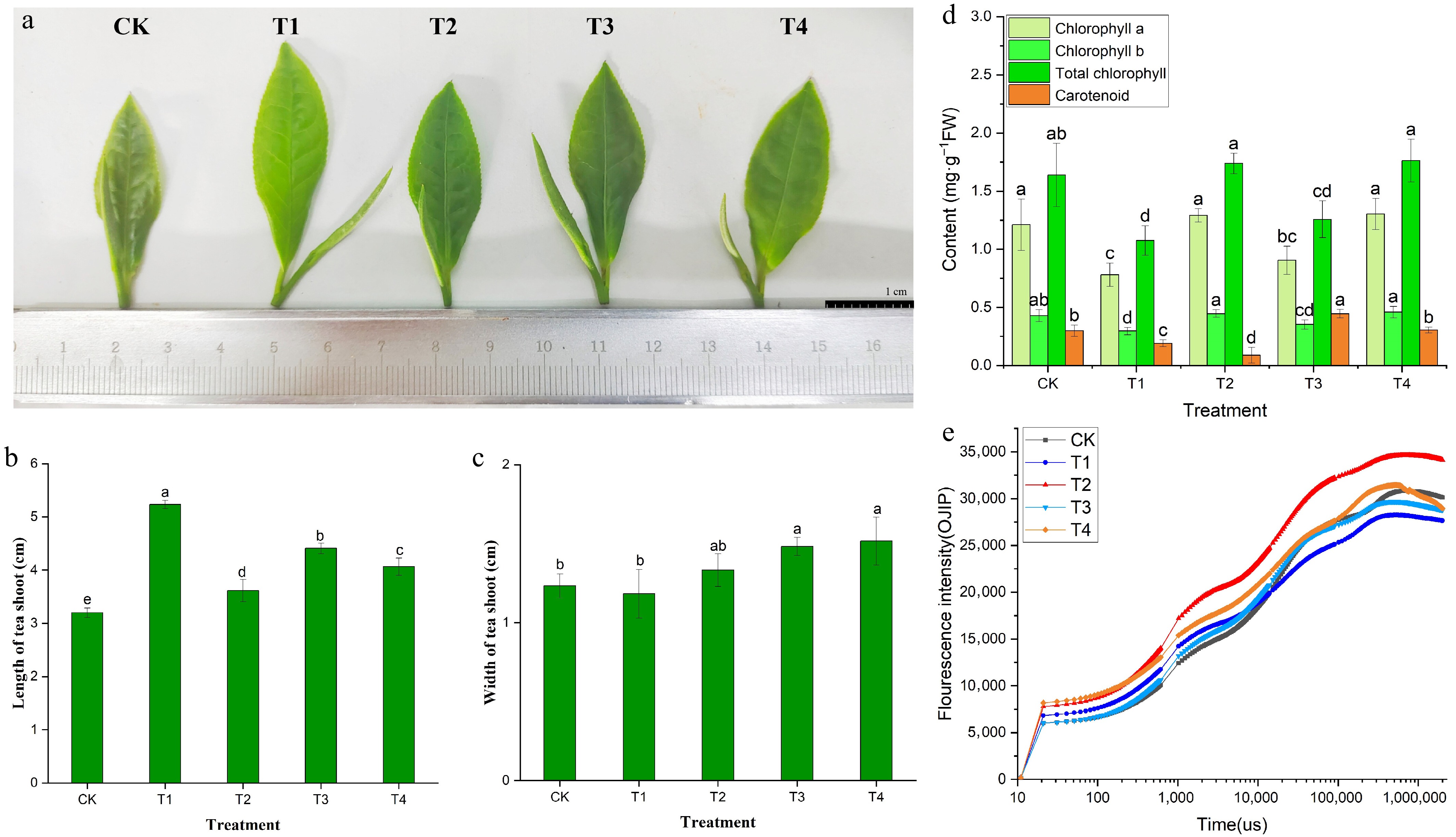 Leaf color phenotype (a), bud growth (b, c), photosynthetic pigment content (d), and OJIP curve (e) of BJHJC leaves under different light treatments. Different letters represent significant differences between groups (p < 0.05).