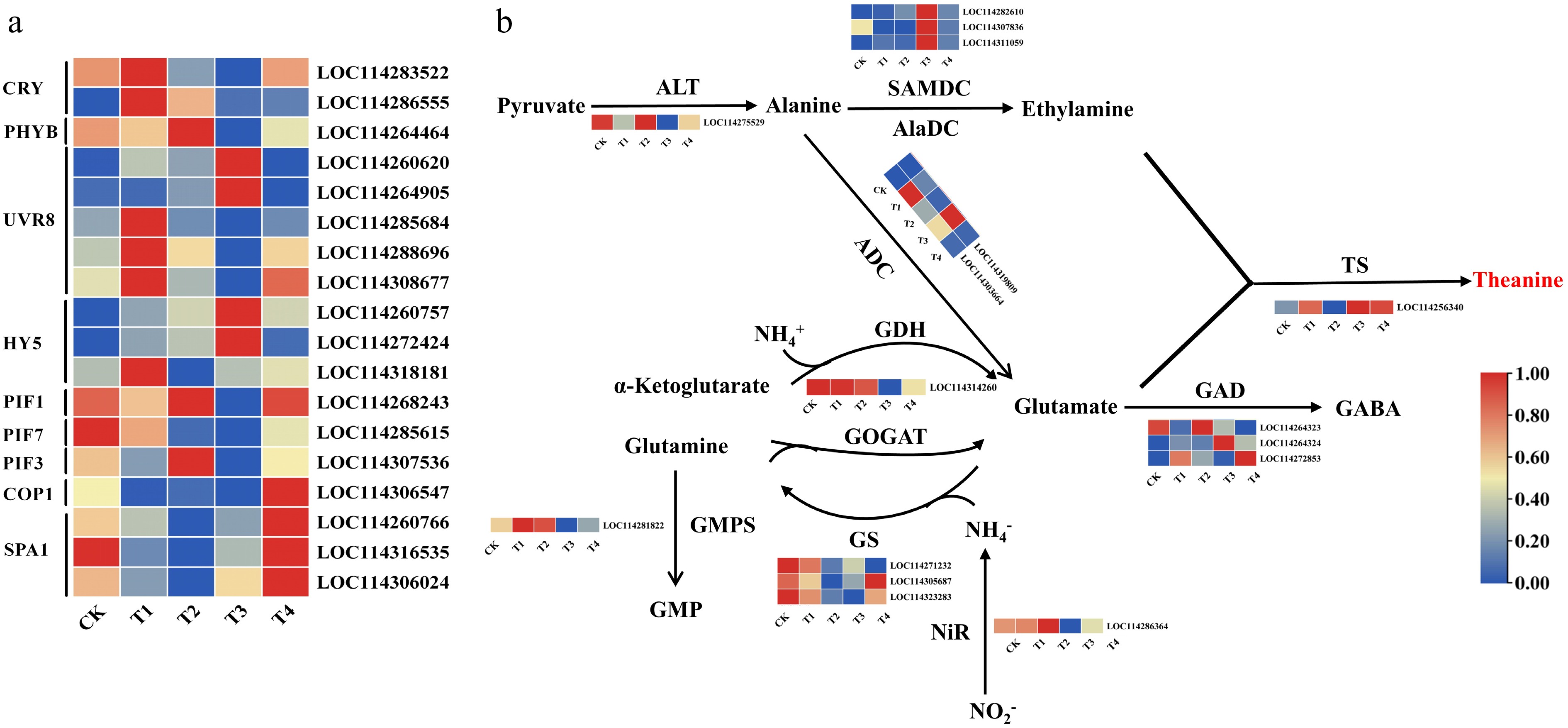 The metabolic pathway of theanine biosynthesis and the key genes involved in the process have been clearly identified, including CsTS, CsGS, and CsAlaDC, which regulate the primary precursor, ethylamine. This study identified and analyzed several genes associated with this pathway (Fig. 4b), revealing significant differences in expression across treatments. CsALT (LOC114275529) showed high expression under the CK and T3 treatments but low expression under the T4 treatment. GsTS (LOC114256340) and CsADC (LOC114319809/LOC114303664) showed the highest expression under the T1 and T3 treatments, in contrast to the other treatments. CsSAMDC (LOC11428610/LOC114307836) showed the highest expression under the T3 treatment compared with the other treatments. CsGDH (LOC114314260) showed high expression under the CK, T2, and T3 treatments. CsGS (LOC114305687) showed the highest expression under the T4 treatment compared with the other treatments. CsGMPS (LOC114281822) showed the highest expression under the T1 and T2 treatments. CsNiR (LOC114286364) showed higher expression under the CK and T2 treatments but low expression under the T3 treatment. Three genes related to glutamate decarboxylase (CsGAD) were differently expressed. The level of CsGAD1 (LOC114264323) was upregulated under the T3 and CK treatments, whereas CsGAD2 (LOC114264324) and CsGAD3 (LOC114272853) showed higher levels of expression under T3 and T4, respectively. These results suggest that the response of biosynthetic genes to light may be the primary mechanism underlying the observed differences in theanine accumulation in tea leaves.