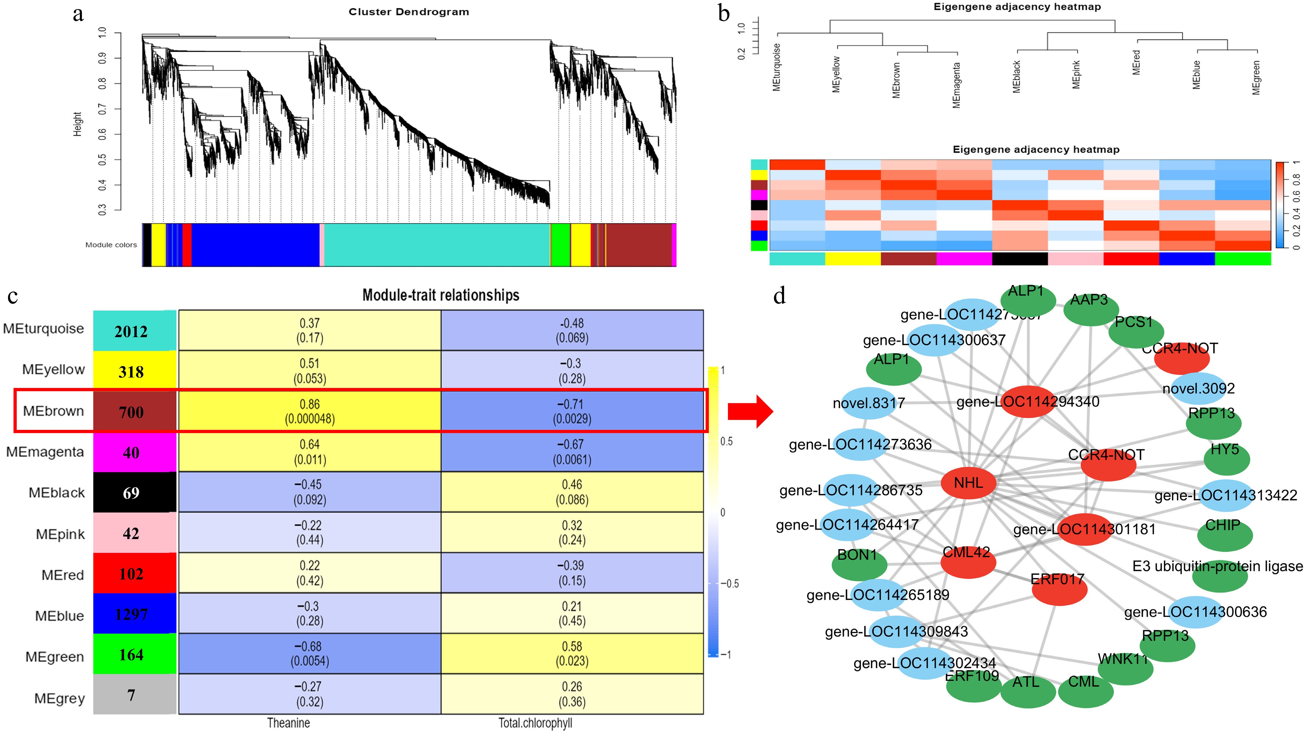 Gene expression clustering and transcriptome co-expression analysis. (a) Hierarchical cluster tree showing 10 modules obtained by weighted gene co-expression network analysis (WGCNA). (b) Adjacency heatmap of featured genes. Module–metabolite correlation matrix. (c)The number of genes in each module is displayed in the left box, and the correlation coefficients and p-values between modules and metabolites are shown at the row–column intersections. Co-expression subnetwork analysis of the brown module associated with theanine and chlorophyll metabolic accumulation. (d) The top 60 nodes of the brown module were selected to construct the network, with hub genes marked in red, and genes involved in metabolism marked in green.