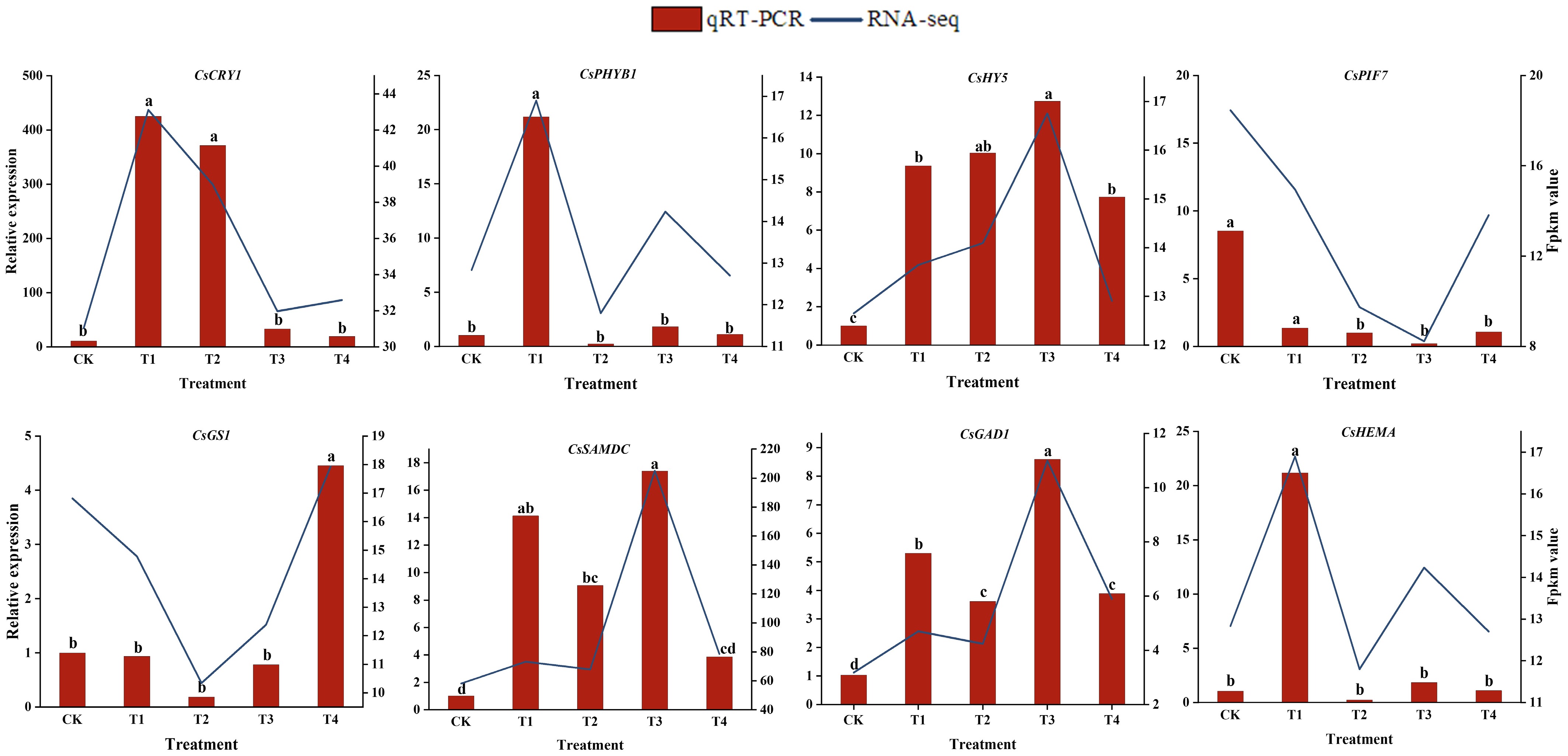 • To verify the accuracy of the RNA-seq data, eight representative genes were randomly selected for qRT-PCR. As shown in Fig. 6, the expression trends of genes in the RNA-Seq data were generally consistent with the transcriptome analysis results. These included the photoreceptors CsCRY and CsPHYB, the light signaling transcription factors CsHY5 and CsPIF, and theanine and chlorophyll synthesis genes. The results of the qRT-PCR analysis were in agreement with the sequencing results, indicating that the RNA-seq data are accurate and reliable.