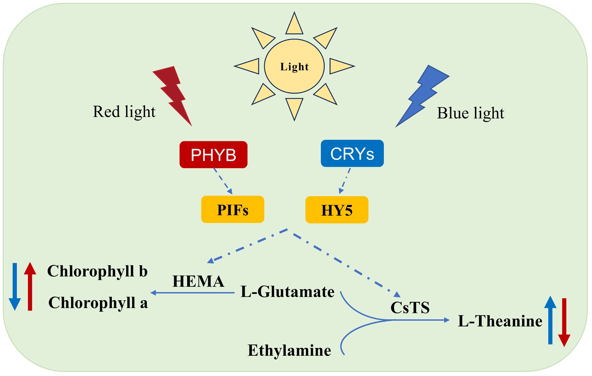 Model diagram of light-induced theanine and chlorophyll biosynthesis.