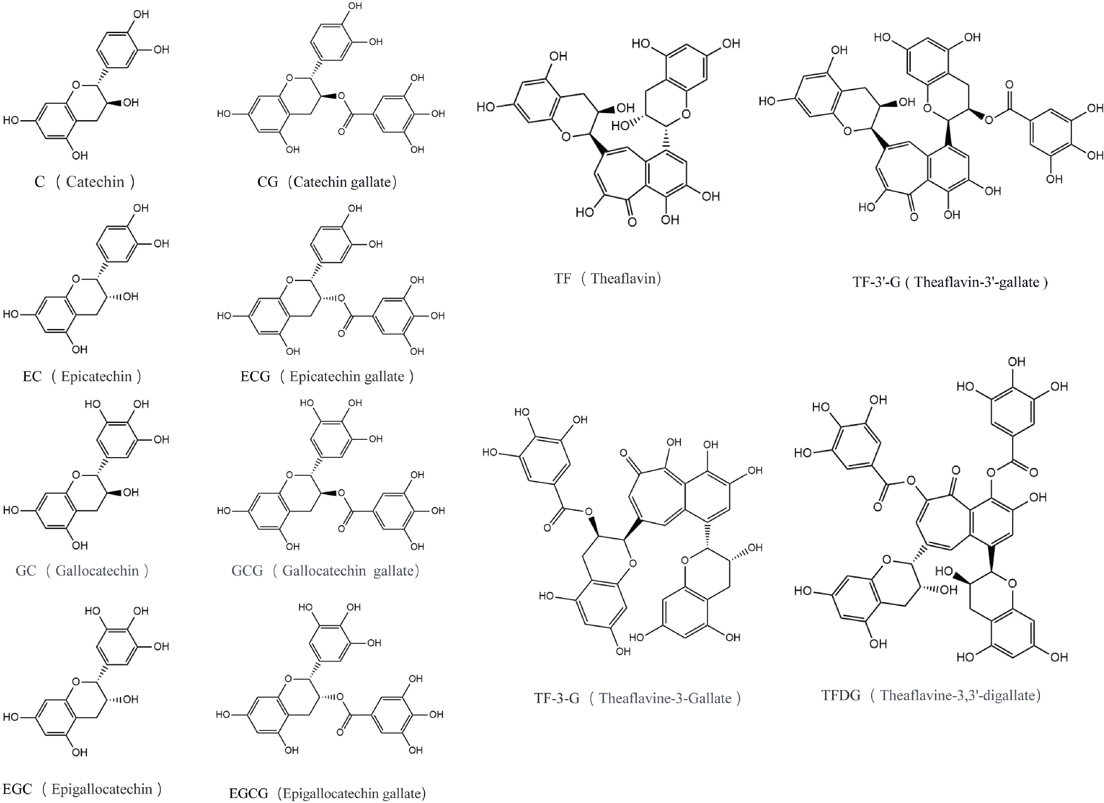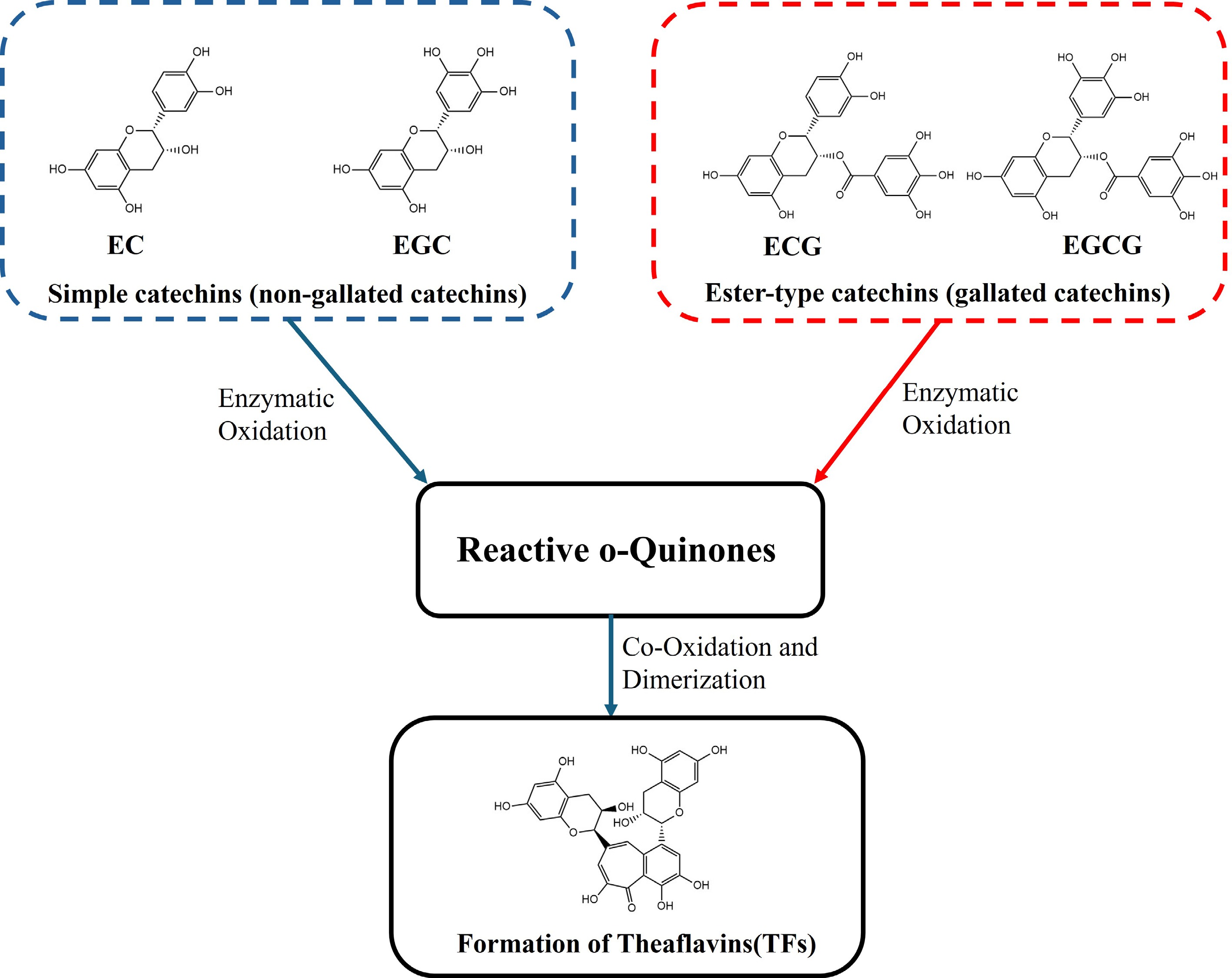 The characteristic flavor and bioactivity of different tea types are largely determined by the transformation of these native catechins during processing. As illustrated in Fig. 3, the enzymatic oxidation of catechins by polyphenol oxidase initiates a cascade of polymerization reactions. This process generates a spectrum of oxidized tea polyphenols (OTPs), starting with the formation of theaflavins from specific pairwise combinations of catechins, followed by further oxidation to thearubigins and eventually theabrownins. This transformation pathway is fundamental to understanding the distinct compositional profiles and associated health effects of semifermented (e.g., oolong tea) and fully fermented teas (e.g., black tea and dark tea) compared with nonfermented green tea.