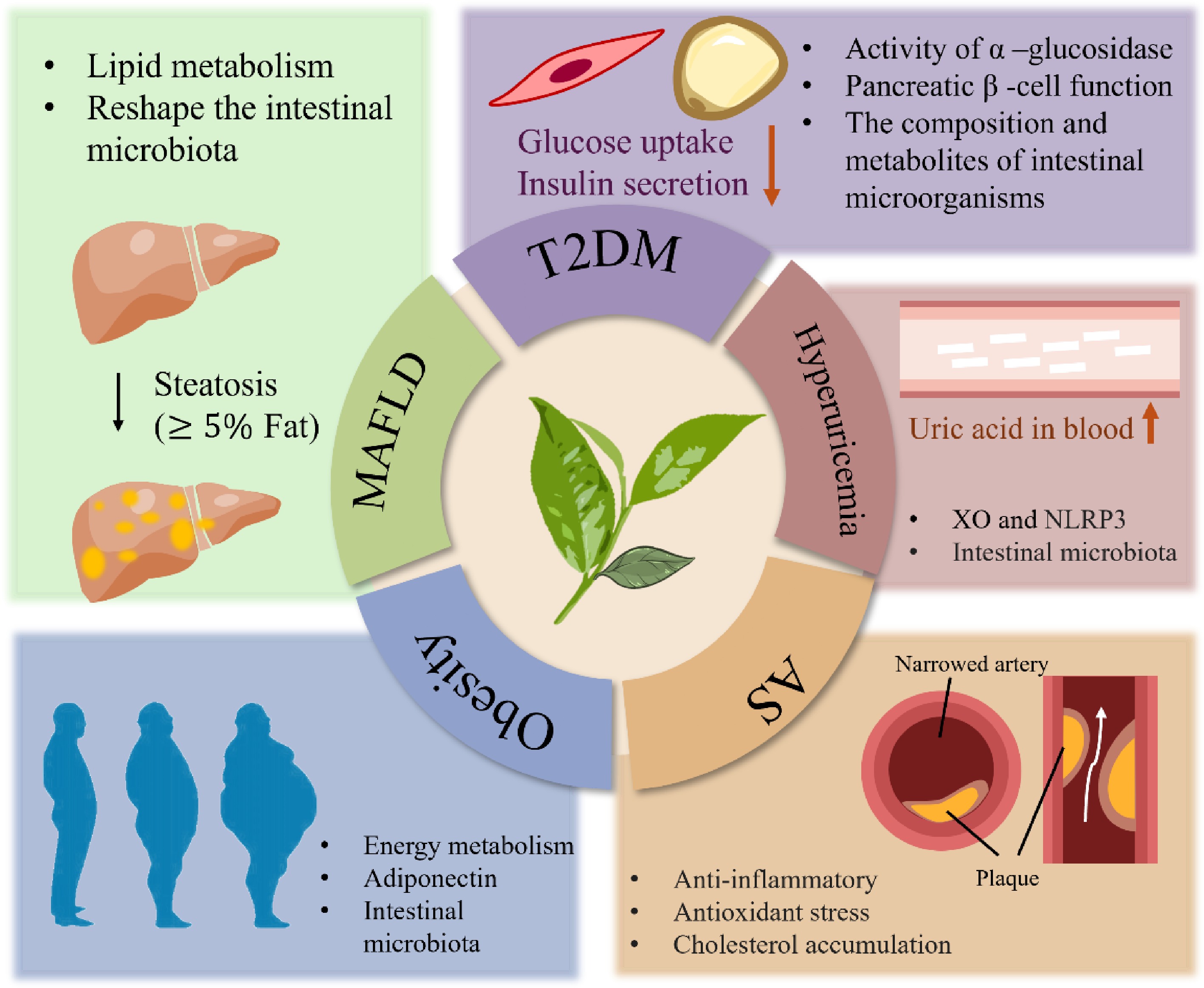 Tea catechins and their oxidative polymers, a class of ubiquitous phenolic compounds in Camellia sinensis, demonstrate unique therapeutic potential against CMDs such as T2DM and atherosclerosis, primarily through their anti-inflammatory and antioxidant properties (Fig. 4). This review systematically elucidates their multitarget mechanisms involving lipid metabolism regulation, insulin resistance amelioration, and inflammatory pathway suppression. Their natural origin and favorable safety profile provide a scientific rationale for developing dietary interventions aligned with the 'medicine–food homology' concept. Notably, bioactive metabolites generated via gut microbiota-mediated biotransformation may synergize with parental catechins, offering novel perspectives for deciphering their holistic biological effects.