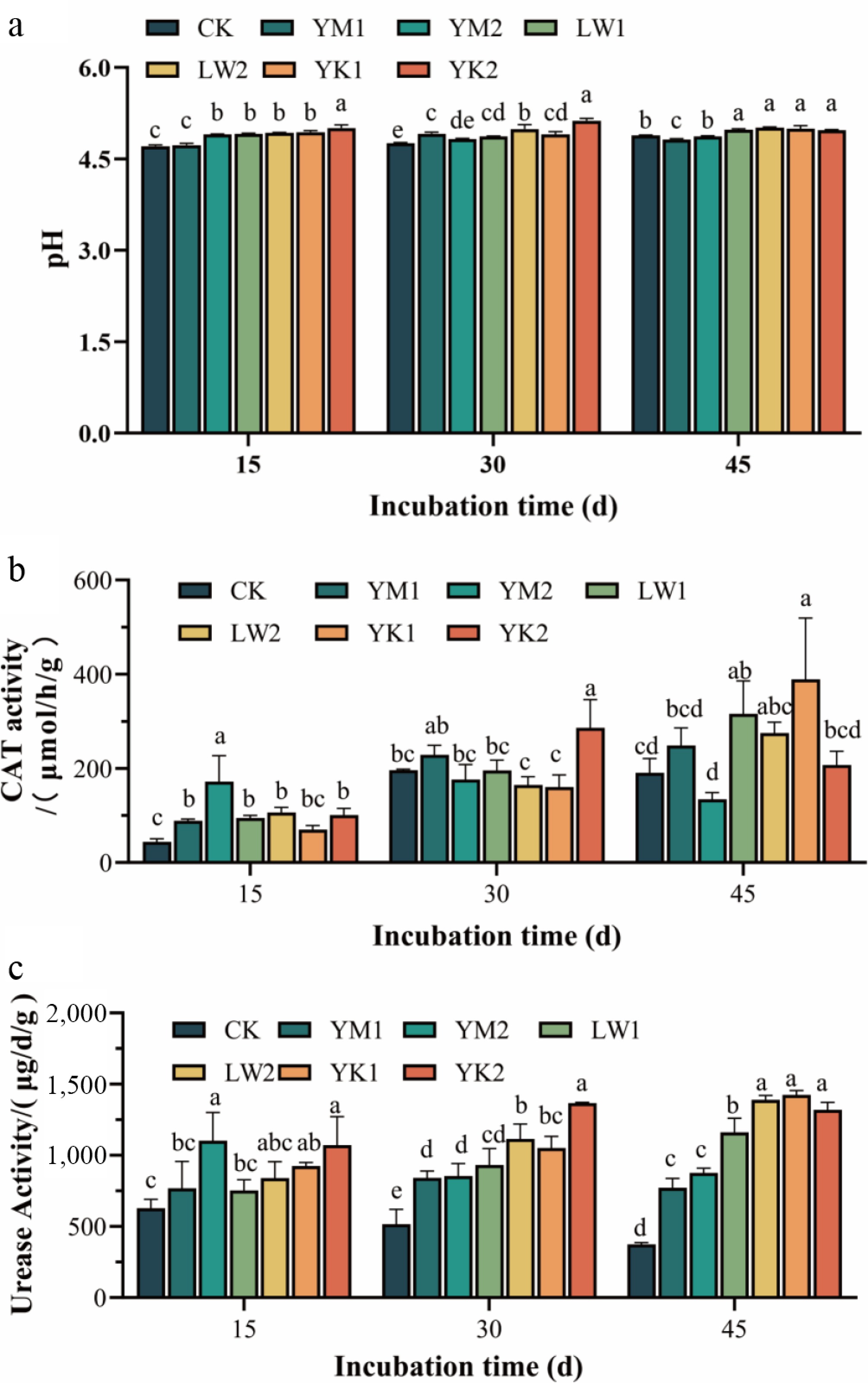 Effect of application of different biochar treatments on soil pH and enzyme activity variations in tea plantations during 45 d of incubation. (a) pH. (b) CAT activity. (c) Urease activity. CK (no biochar), YM1 (0.5% corn stover biochar), YM2 (1.0% corn stover biochar), LW1 (0.5% reed biochar), LW2 (1.0% reed biochar), YK1 (0.5% coconut shell biochar), YK2 (1.0% coconut shell biochar). Different lowercase letters indicate significant differences between treatments after the same treatment time (p < 0.05).