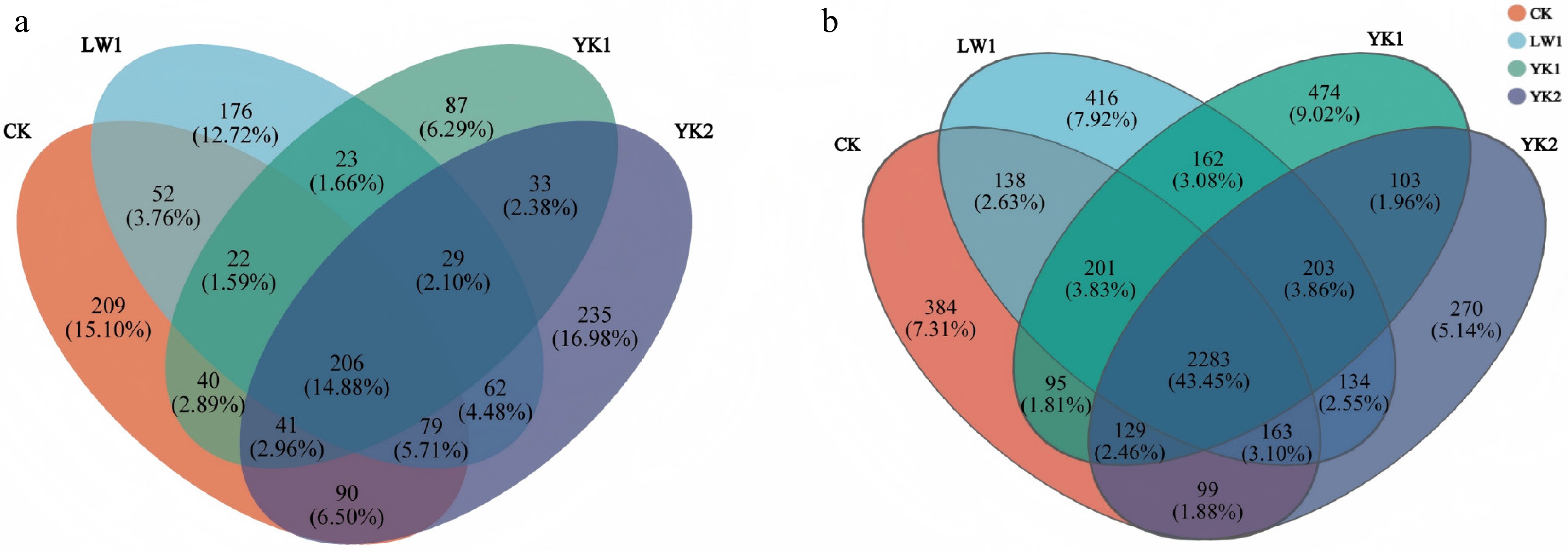 Venn diagram illustrating Operational Taxonomic Unit (OTU) of (a) soil fungal, and (b) bacterial communities under different biochar application. CK (no biochar), LW1 (0.5% reed biochar), YK1 (0.5% coconut shell biochar), YK2 (1.0% coconut shell biochar).