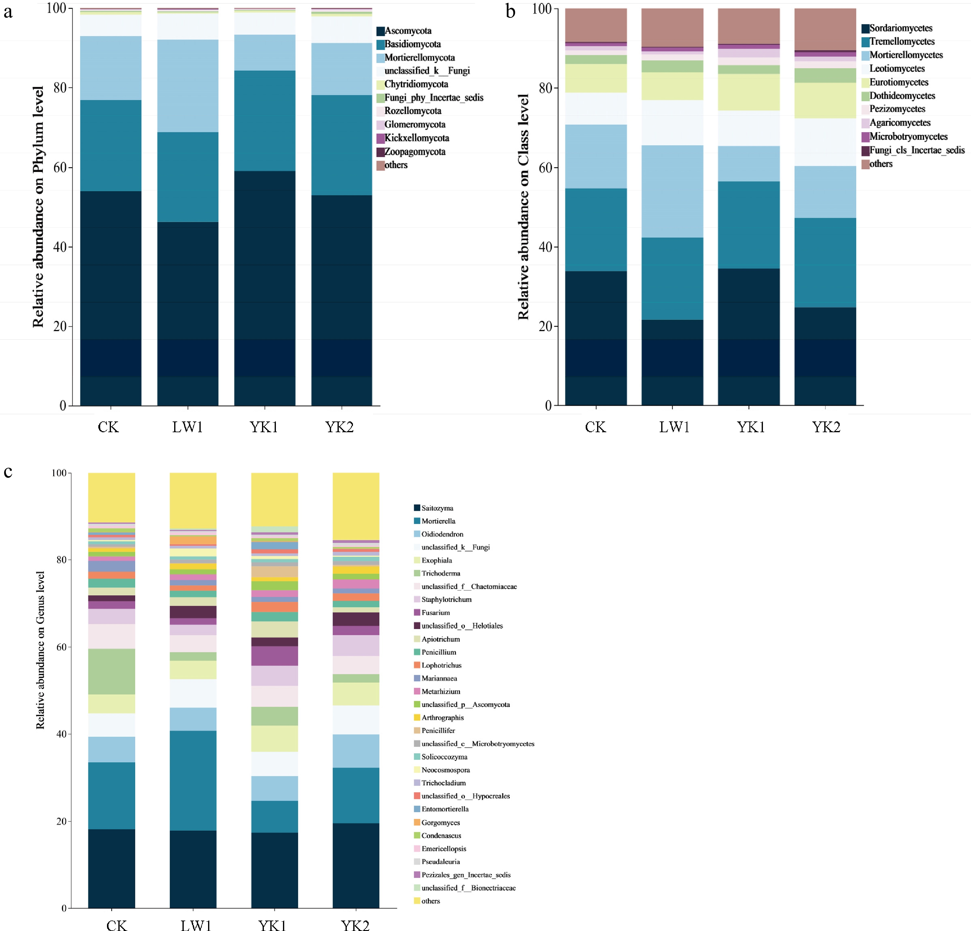 Changes in (a) phylum, (b) class, and (c) genus level fungal community diversity in tea plantation soil under different biochar treatments. CK (no biochar), LW1 (0.5% reed biochar), YK1 (0.5% coconut shell biochar), YK2 (1.0% coconut shell biochar).