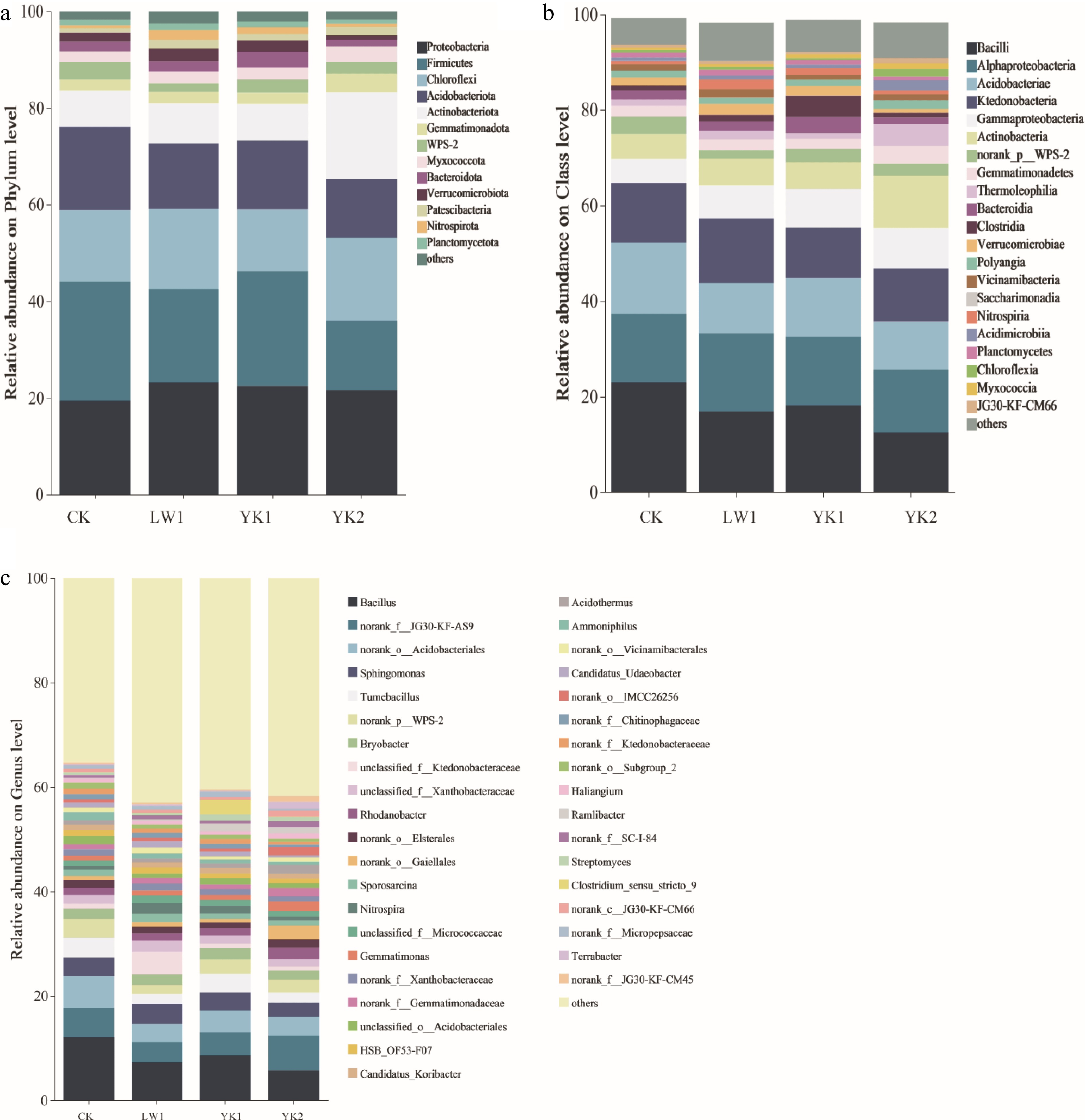 Changes in (a) phylum, (b) class, and (c) genus level bacterial community diversity in tea plantation soil. CK (no biochar), LW1 (0.5% reed biochar), YK1 (0.5% coconut shell biochar), YK2 (1.0% coconut shell biochar).