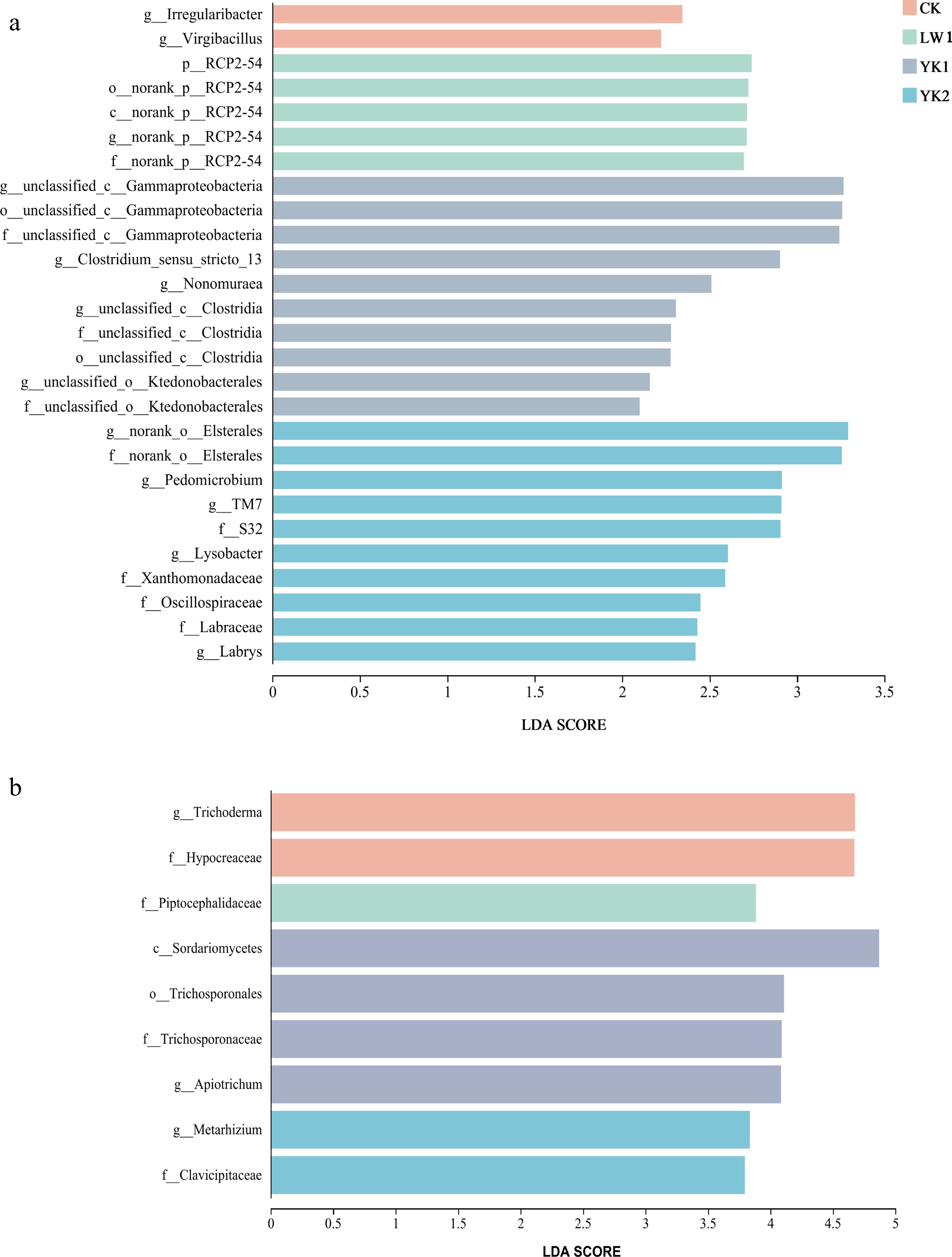 Histogram of the Linear Discriminant Analysis (LDA) score computed for differentially abundant taxa (genus level) in (a) bacteria, and (b) fungi. CK (no biochar), LW1 (0.5% reed biochar), YK1 (0.5% coconut shell biochar), YK2 (1.0% coconut shell biochar).